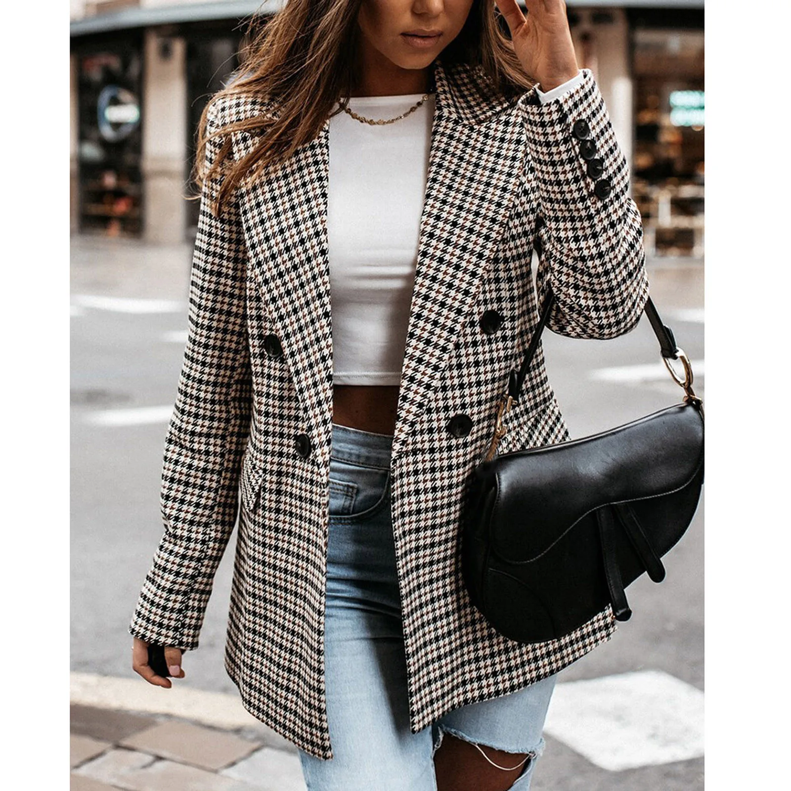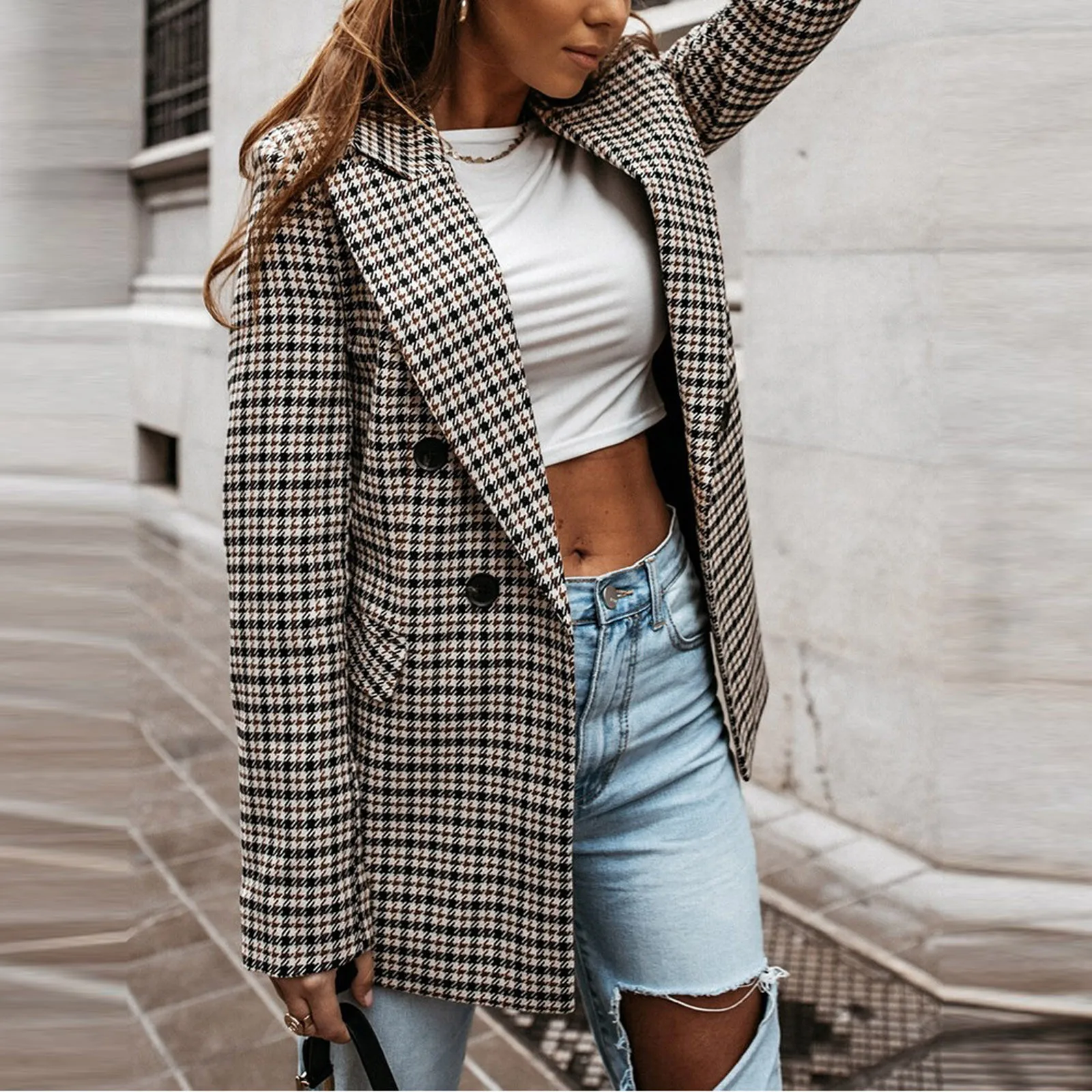 Женский блейзер с лацканами, в шотландскую клетку, двубортный, Повседневный, с карманами, # T2G, осень 2021