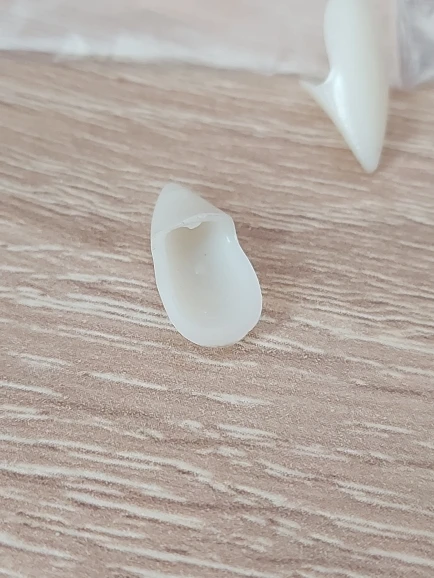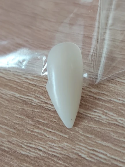 Отличные клыки, остренькие. Садятся хорошо, но все равно нужно чем-то закреплять, думаю приобрести средство для протезов. По цвету не совсем белоснежные ближе к естественной эмали. Но для меня все равно оказались чуть светловаты, хотя разговор о естественности тут и не идёт.