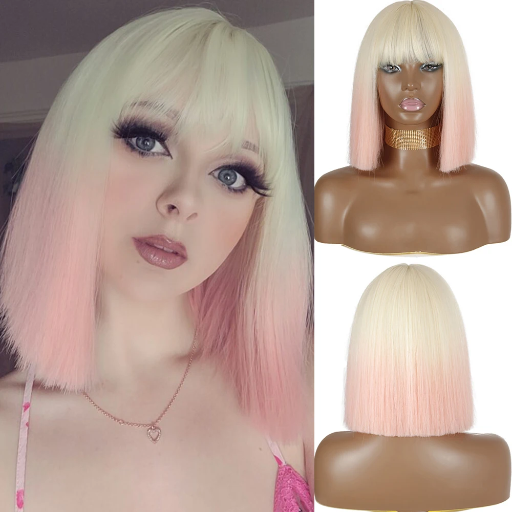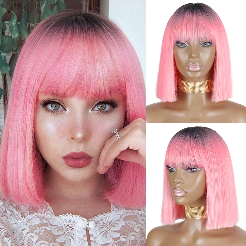 Короткий синтетический женский парик с челкой, для ежедневного использования, из высокотемпературных волокон, цвет красныйрозовыйоранжевыйсиний
