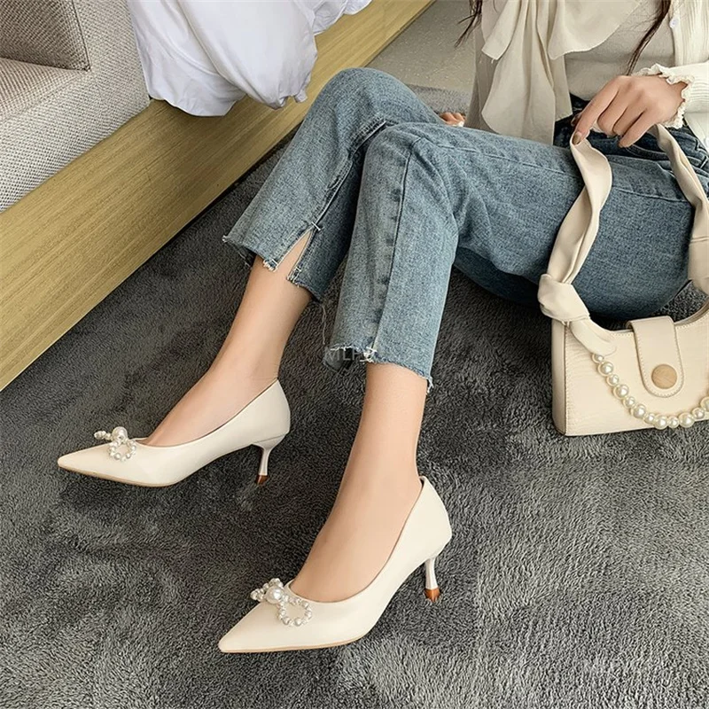 Женские туфли на высоком каблуке-шпильке, с острым носком и жемчужн...