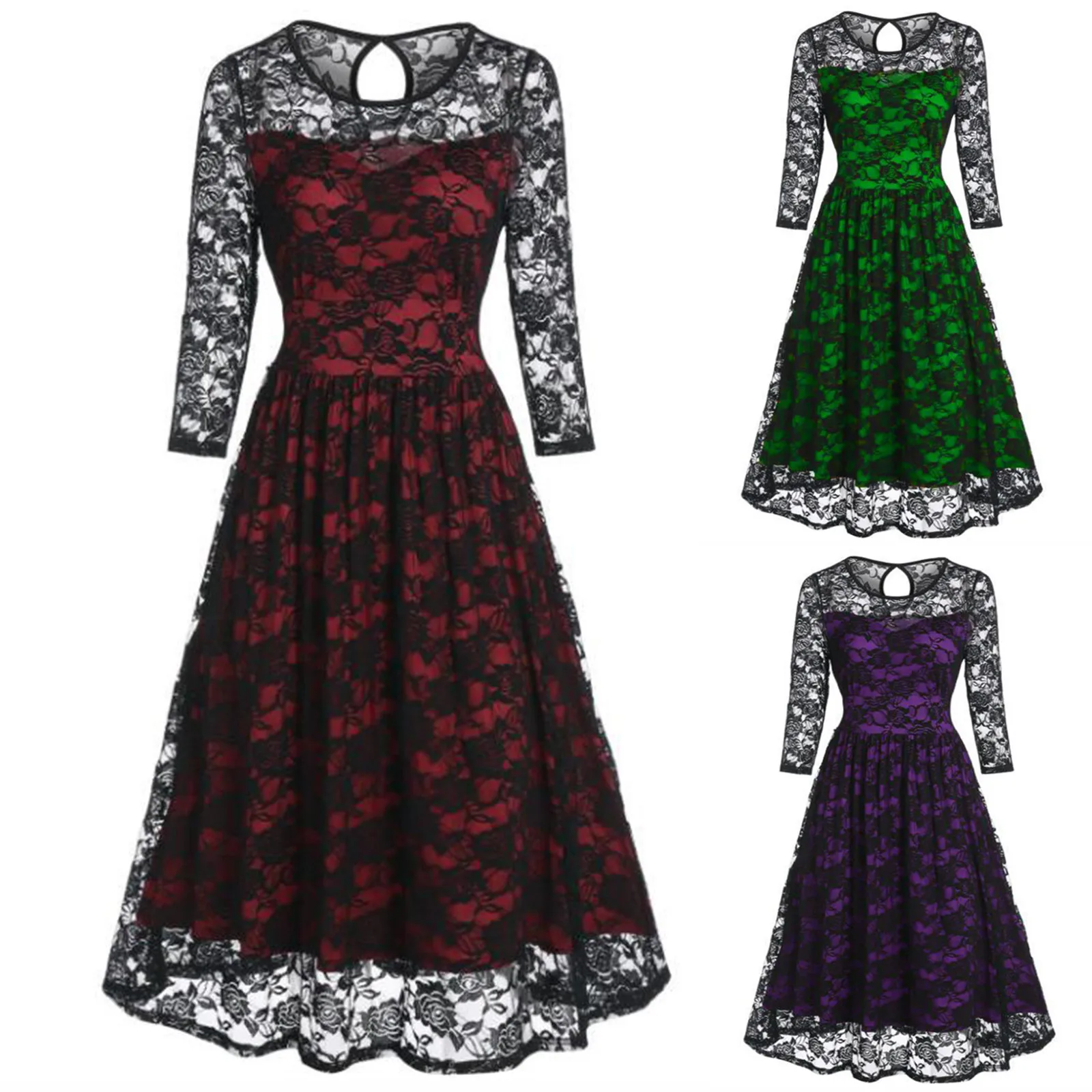 Женское винтажное кружевное платье миди, Привлекательное платье в стиле ретро с U-образным вырезом, длинным рукавом и принтом роз, праздничное платье Вечерние вечеринки