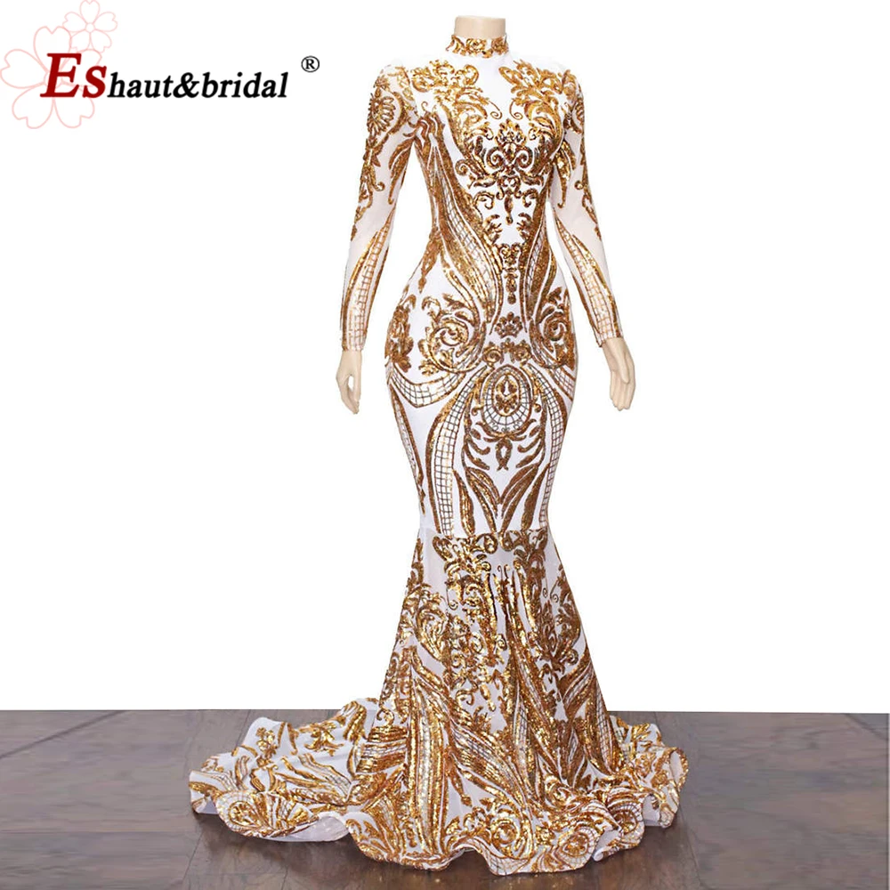 Женское платье-Русалка с блестками, черное платье для выпускного вечера, с длинным рукавом, высоким воротом, 2021
