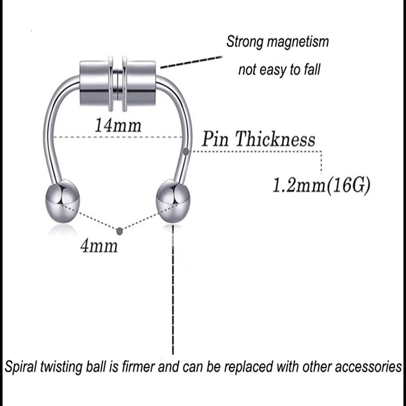 Размер: 1,2*10*3 ммМатериал: нержавеющая сталь + цинковый сплавМагнитный расстояние: 0,2 см-0,5 см (подходит для всасывания)Безопасный материал никоим образом не повлияет на нос, и очень светильник, так что вы не будете чувствовать себя некомфортноЕсли есть проблема с вашим продуктом, пожалуйста, дайте мне знать, и я решим проблему для вас. Я проверю магнетизм и аксессуары перед отправкой каждого продукта.
