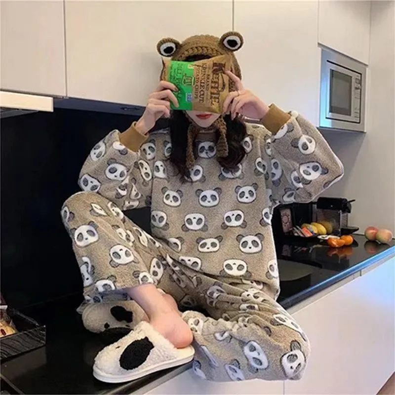 Пижама женская, на флисе, с длинным рукавом и принтом в виде панды