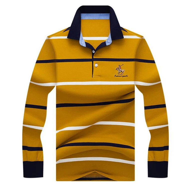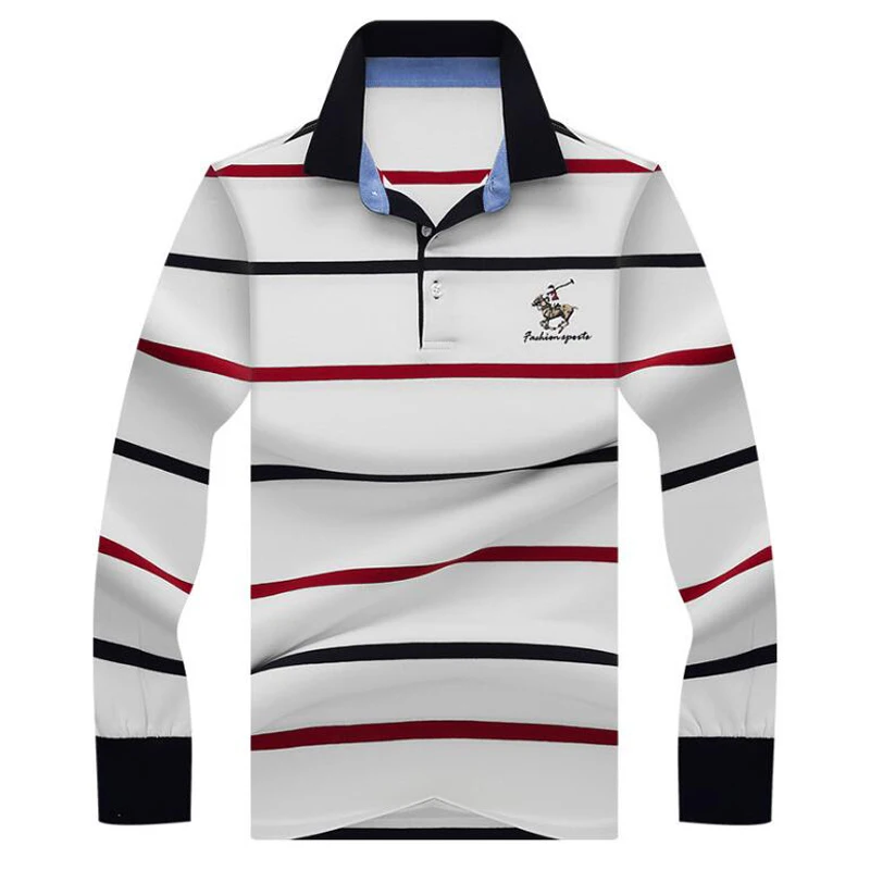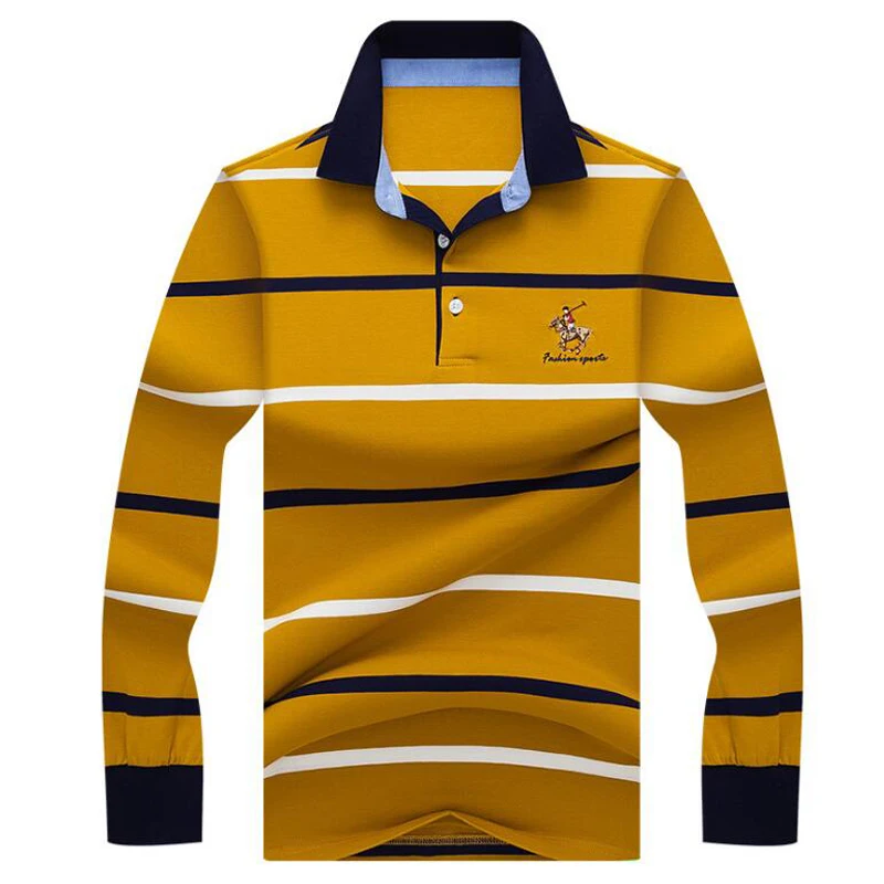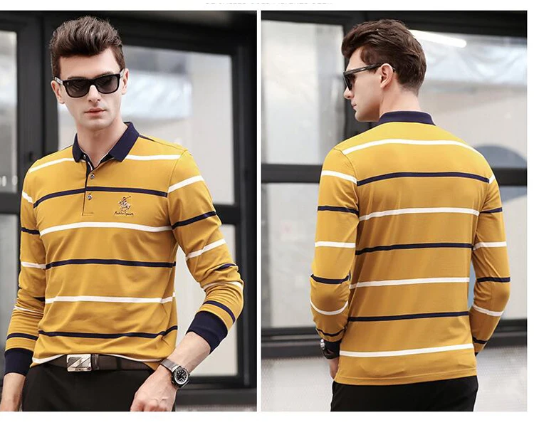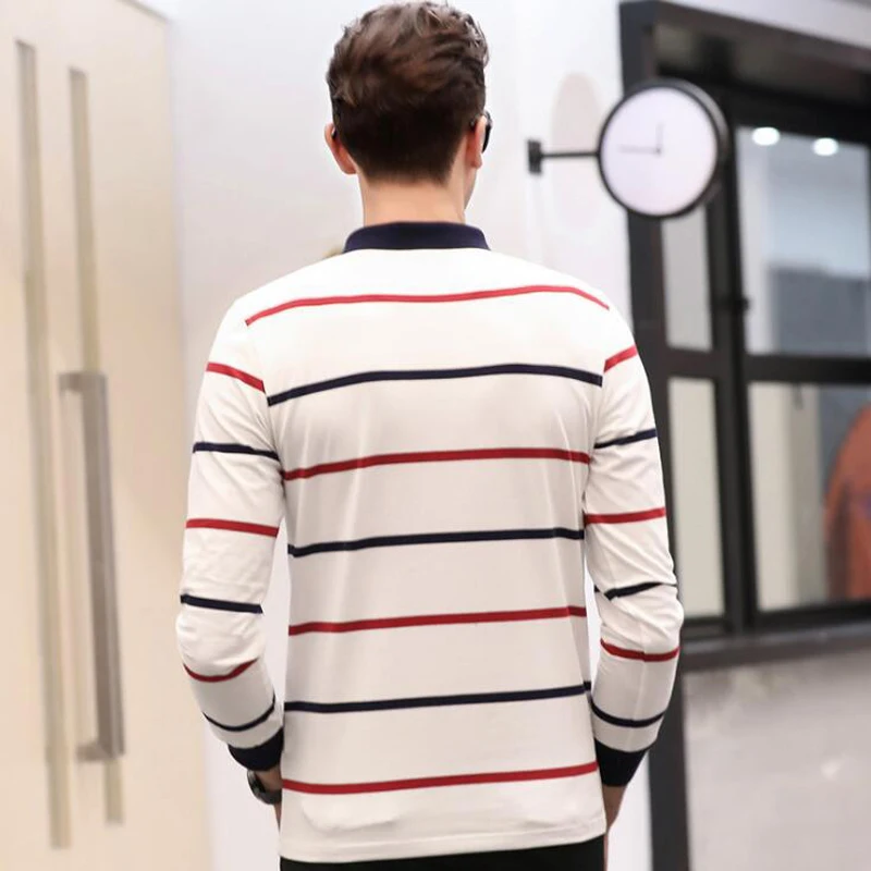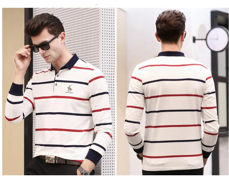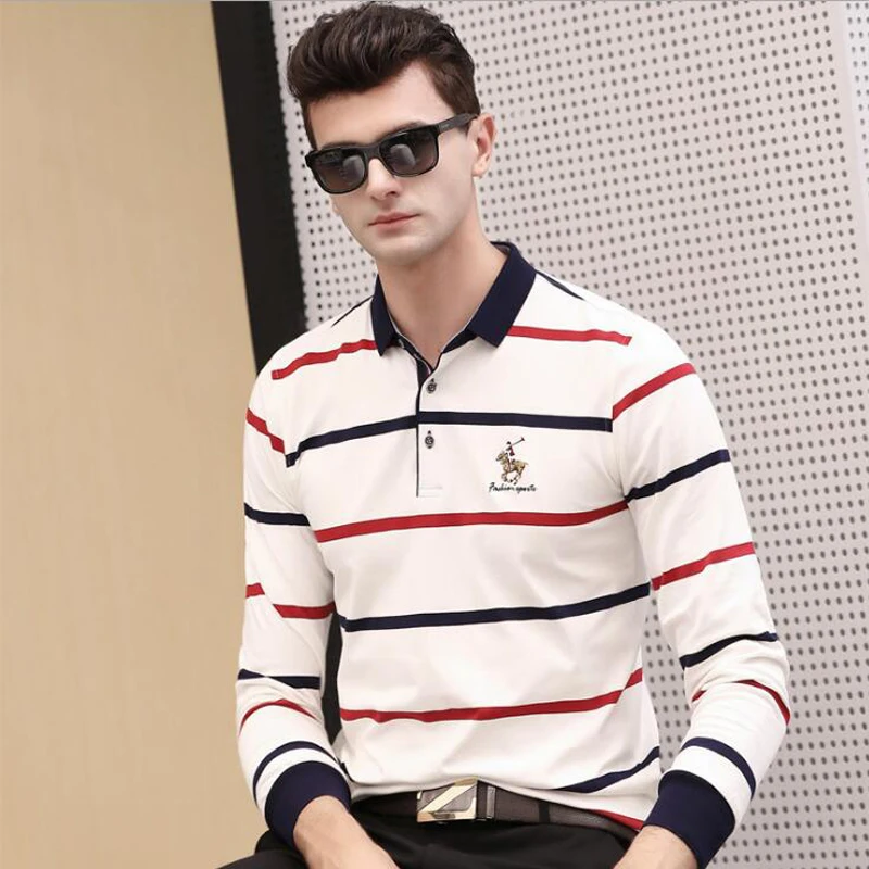 Рубашка-поло мужская в полоску, хлопок, длинный рукав, повседневная одежда, осень-зима