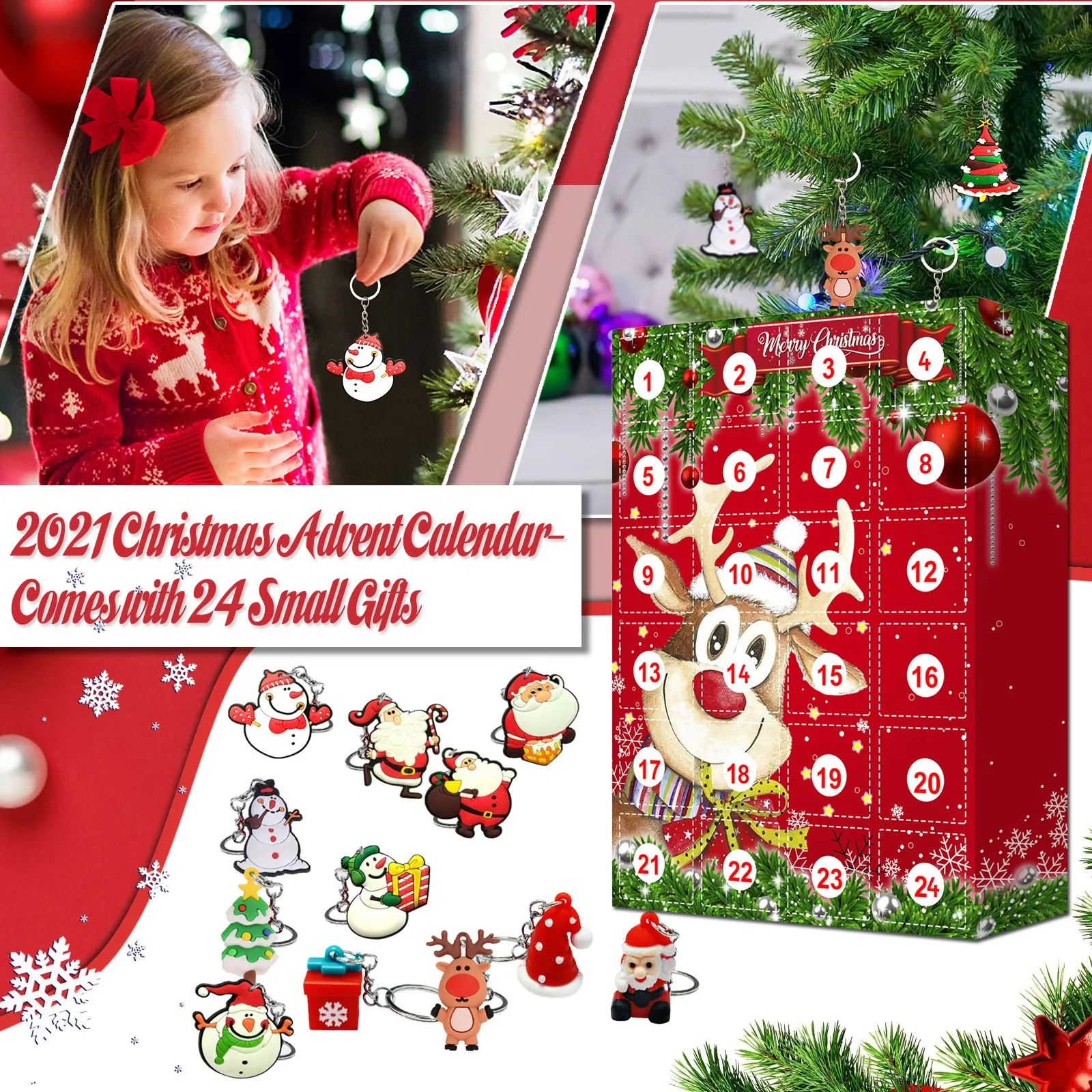 [Рождественские подарки]: небольшие подарки в календаре включают снеговика, лося, елку и многие другие игрушки. Сверху есть кольцо, его можно использовать как брелок или украшение и повесить куда угодно.