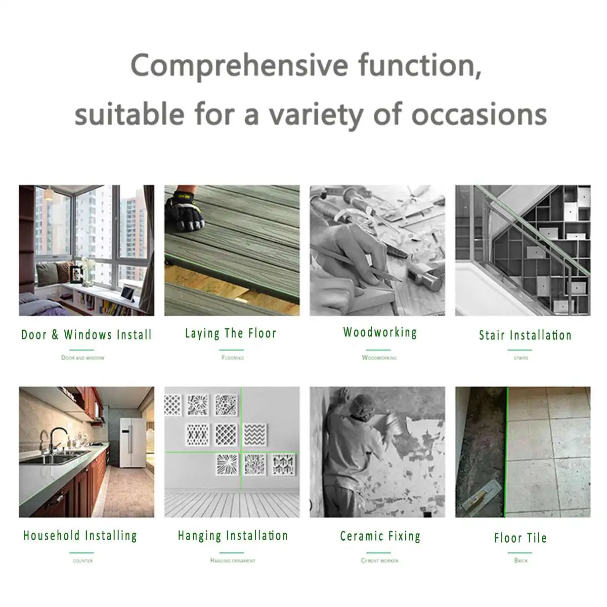 Информация о продукте:Особенности:-3D 12 линейный лазерный провод для точного позиционирования.-Самонивелирующаяся система.-Гибкость и стабильность.-Использование зарядки.-Вращающееся на 360 ° основание с тонкой ручкой настройки, быстро идентифицирует цель.-Водонепроницаемость, износостойкость и изысканность, простота в эксплуатации.-Утолщенное основание обеспечивает стабильную поддержку и ударопрочность, ударопрочность.-Легко носить с собой чехол, обеспечивая быструю и удобную мобильность и хранение.-Широкое применение для вспомогательной фиксации плитки, украшения стен, фиксации напольной плитки, лестничных поручней и многого другого.Характеристики:-Разъем питания Adpater: штепсельная вилка US/EU (опционально)-Мощность: 100-240 В переменного тока зарядное устройство-Лазерный светильник: 360 ° x3, 12 линий-Лазерный светильник источник: длина волны лазера 532nm-Горизонтальная/Вертикальная Точность: ± 0,2 мм/1 м-Диапазон автоматического выравнивания: ± 3 °-Рабочий диапазон: около 30 м в диаметре-Рабочая температура: -10 ℃ ~ 40 ℃-Температура хранения: -20 ~ 70 ℃-Размер штатива Skrew: 1/4 ", 5/8"-Непрерывное время работы: 3-9 часов