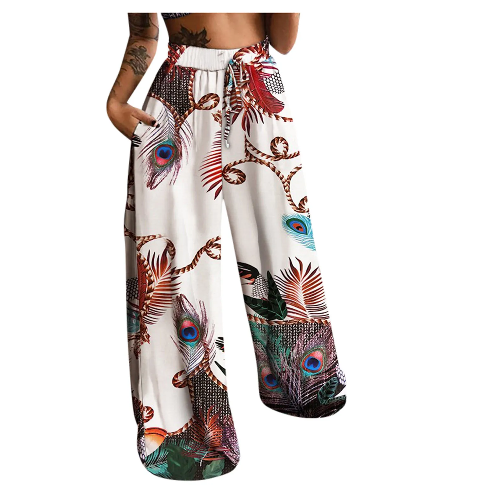 Женские Модные свободные брюки с высокой талией и принтом, длинные брюки в стиле бохо, пляжные брюки с карманами, прямые брюки для женщин