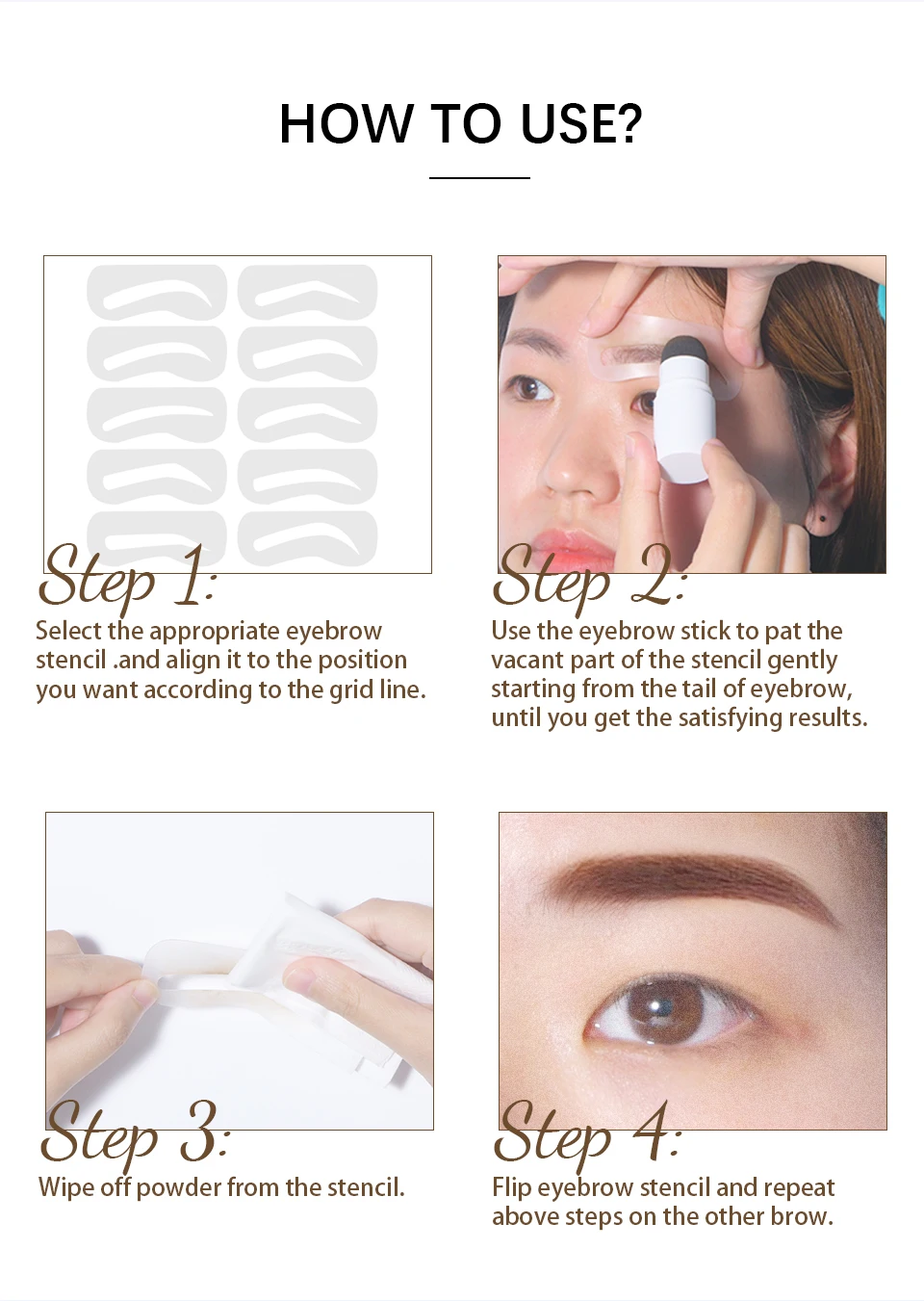 Инструкции по использованию:Советы: с помощью крема для бровей для окрашивания пустой части трафарета, мягко похлопывая, начиная от хвоста брови, до полного заполнения. Пожалуйста, не используйте его, протирая, потому что это не работает хорошо.Примечание:Примечание: печать трафаретов бровей будет отличаться из-за различных партий.Есть три различных варианта использования продукта.1. Этот продукт может использоваться с зажимами для бровей и может использоваться в качестве хорошей пудры для бровей, чтобы помочь вам нарисовать идеальные брови.2. Этот продукт может использоваться как линия для волос и имеет хороший эффект покрытия линии волос.3. Этот продукт также может использоваться в качестве контурного порошка.Идеальный продукт, который убивает трех птиц одним камнем, 3-1 продукт. Пожалуйста, будьте уверены в покупке.