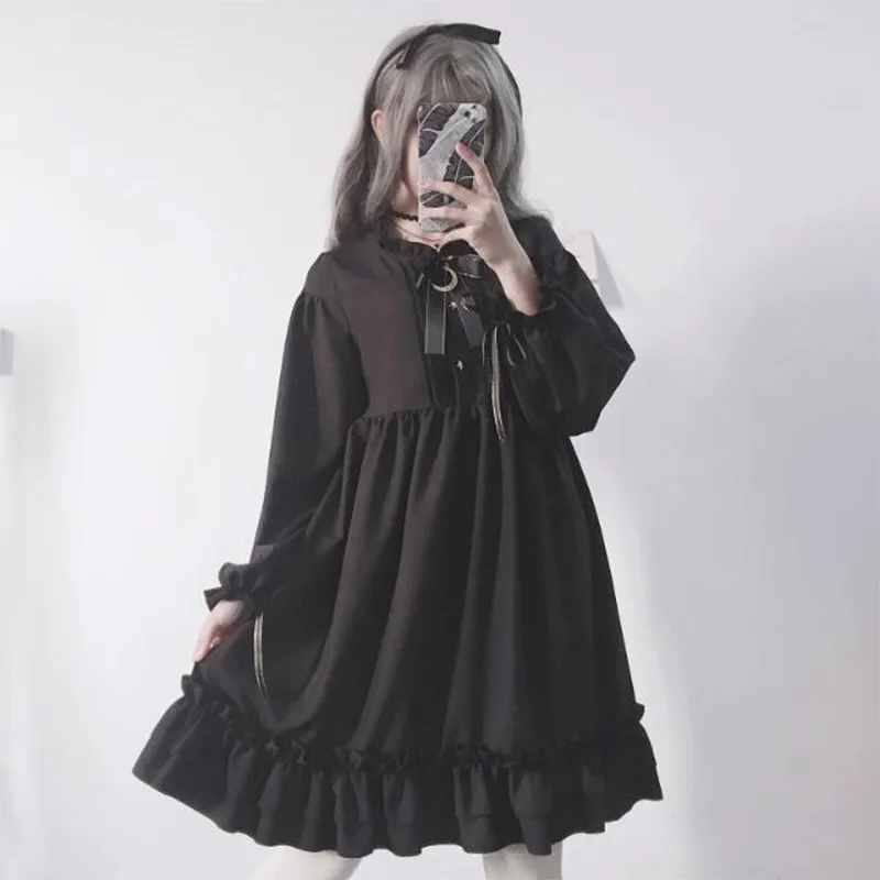 Милое женское готическое платье лолиты KawaiiЯпонское платье для подростков с длинными рукавами в стиле Харадзюку