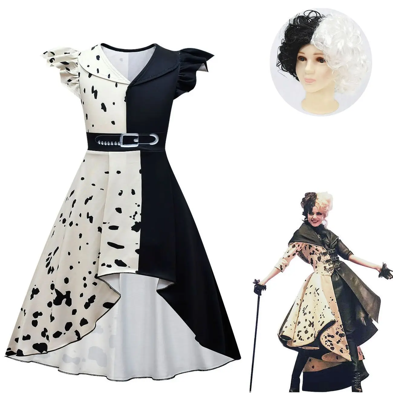 Косплей-костюм для девочек Cruella, наряды на Хэллоуин, черно-белое платье Cruella в горошек, детская одежда для вечеринки