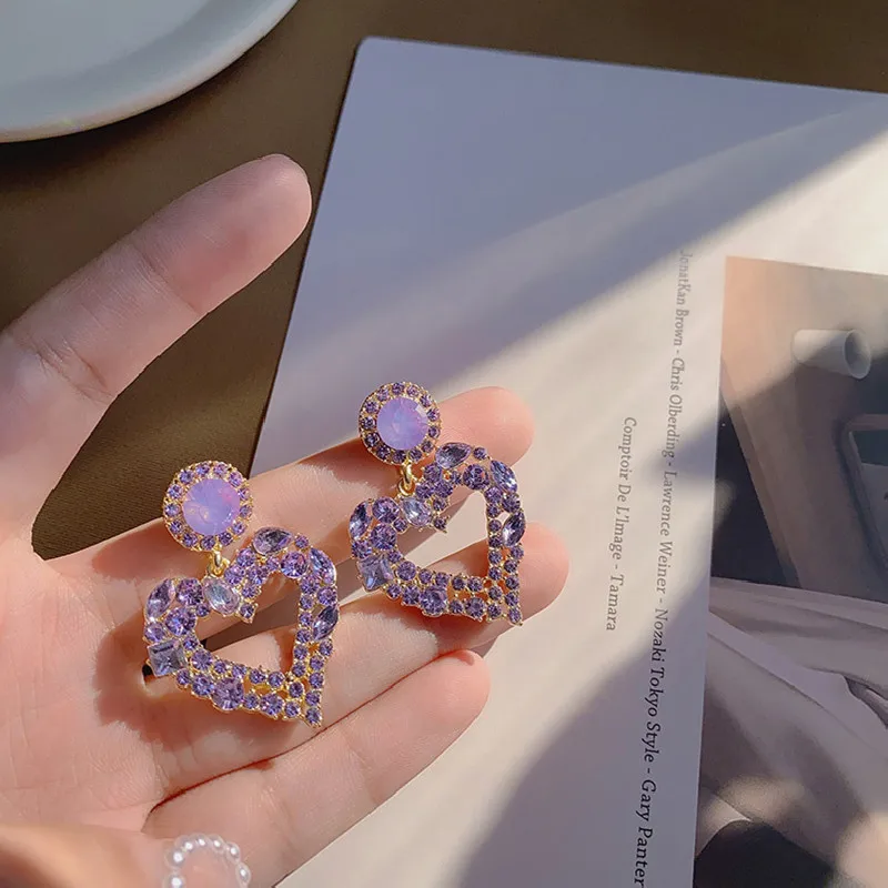 Серьги-капельки женские фиолетовые, стразы, с полым сердцем, с кристаллами