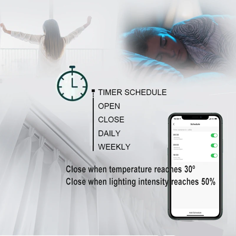 【 1 】 регулярно открывайте и закрывайте шторы【 2 】 управление приложением Tuya【 3. Управляйте занавеской, чтобы она была полностью открыта/полуоткрыта или закрыта【 4 】 датчик освещенности (автоматически закрывается, когда яркость больше, чем настройка)【 5 】 датчик температуры (автоматически закрывается, когда температура больше установленной температуры)【 6 】 Поддержка одного открытия или двойного открытия (для двойного открытия требуется покупка посылка)【 7 】 Поддержка дистанционный пульт, Поддержка третьей вечерние смарт-колонки (Alexa и Google Home)(должны быть оснащены шлюз)