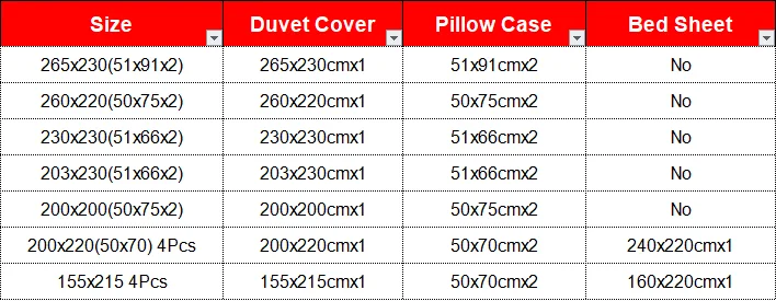 2.Aliexpress Размер постельного белья не является стандартным. Пожалуйста, выберите размер постельного белья в соответствии с вашим размером одеяла.Размер пододеяльника должен совпадать с вашим одеялом, например,Если ваше одеяло 200x200 см, вы должны выбрать пододеяльник 200x200 см,Таким образом, вы должны выбрать соответствующий двойной размер или другие соответствующие размеры.