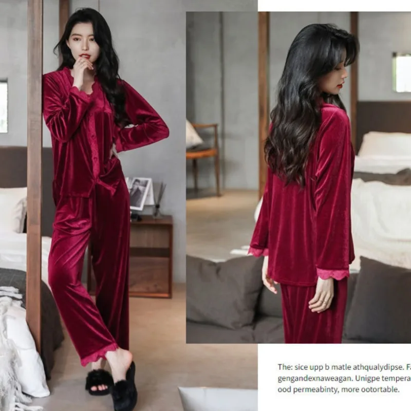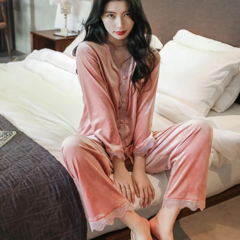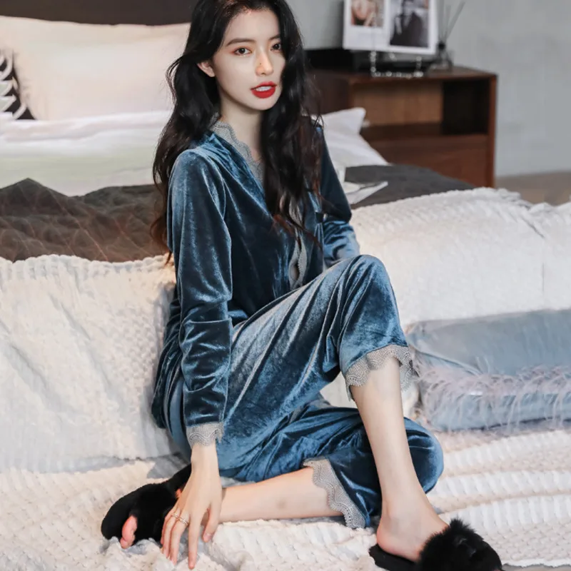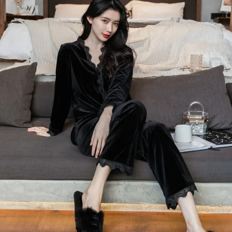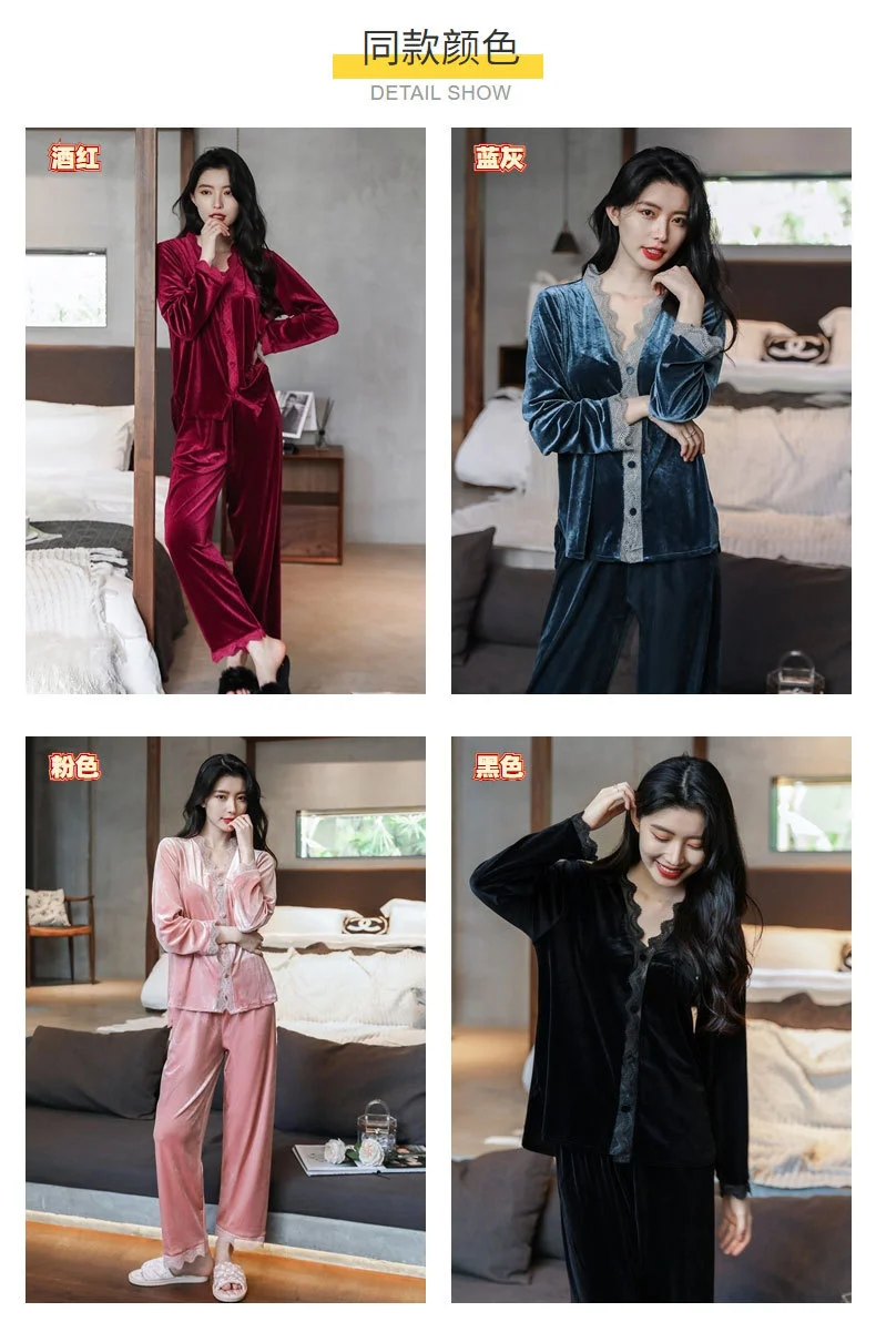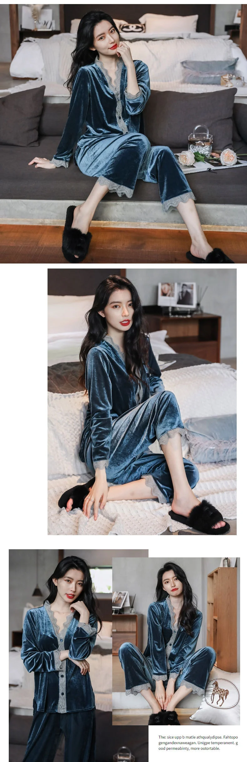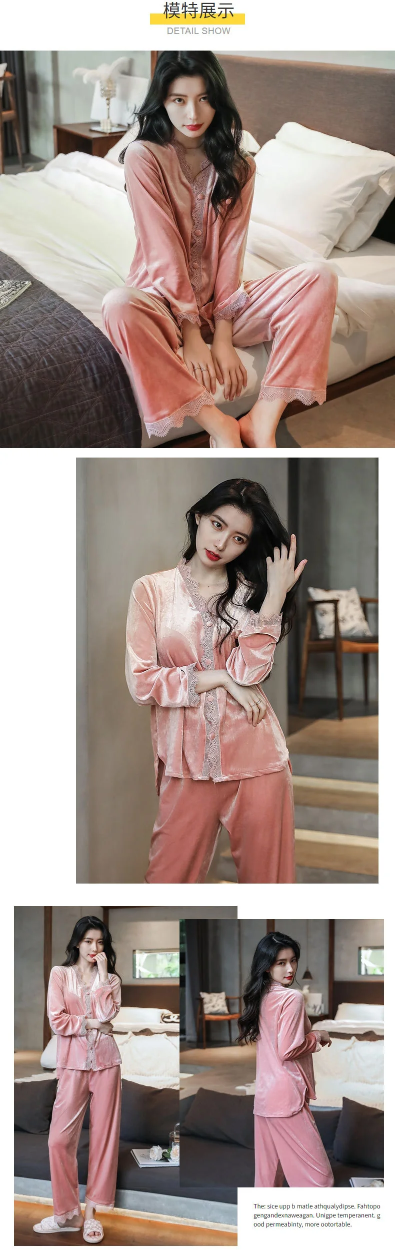 Зимние пижамные комплекты, женские удобные кружевные пижамы с золотым флисом, топы с длинным рукавом и длинные брюки, пижамный комплект, домашний женский костюм