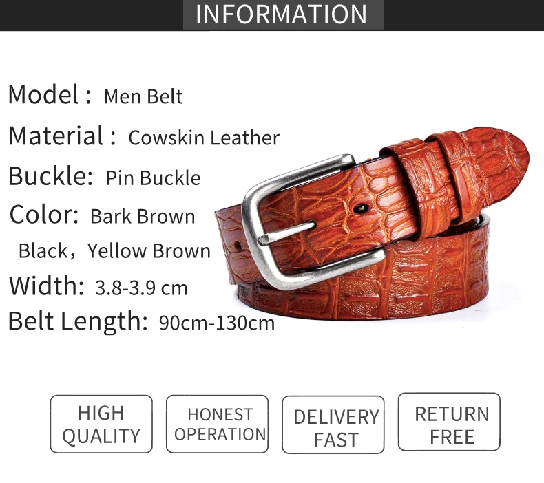 1. Материал ремня: спилок с одним слоем2. Пряжка ремня: цинковый сплав древнего серебряного цвета3. Стиль ремня: узор «крокодиловая кожа»4. Ширина ремешка: 39 мм около 1,53 дюйма5. Размер талии: от 25 до 47 см