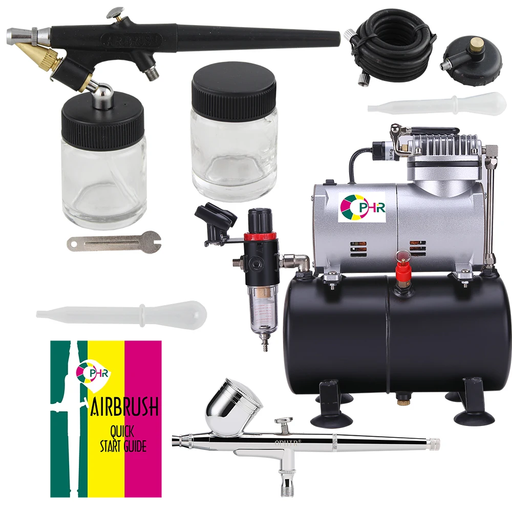 1x одноцилиндровый поршневой компрессор с воздушным баком2x набор аэрографов1 х 1,8 м воздушный шланг1 воздушный фильтр1x Мини-держатель для аэрографа3x руководство