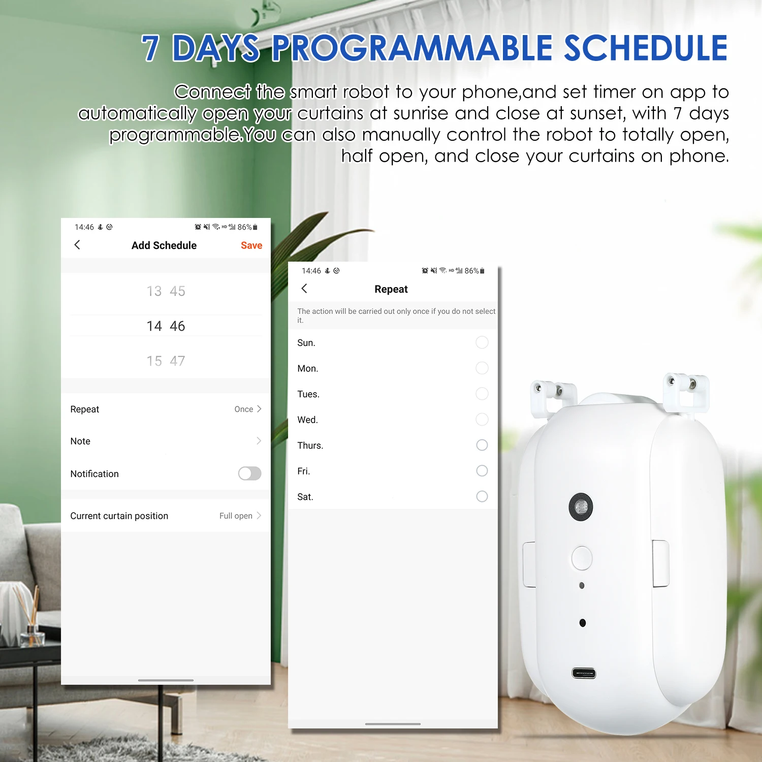 Особенности: Чрезвычайно прост в использовании-Подключите умный робот к своему телефону через BT и установите расписание/таймер в приложении, чтобы автоматически открыть шторы на рассвете и закрыть на закате, с программируемой 7 дней. Вы также можете вручную управлять роботом, чтобы полностью открыть, наполовину открыть и закрыть шторы на телефоне. Смарт-Сенсор s -- оборудован окружающей среды светильник Сенсор и температура Сенсор робот может быть создан для того, чтобы автоматически закроет шторы в тех случаях, когда она определяет ваше комнатной температуре свыше 25 ℃, яркость более 30%. Температура может быть установлена в пределах 10-60 ℃, а светильник может быть установлен в пределах 10-90%. Дистанционное и Голосовое управление-Используйте голосовые команды, такие как «нарисуйте/выводите штор», чтобы управлять роботом-занавеской, добавив умный концентратор/контрольный Лер, чтобы он был совместим с/заменен для Amazon Alexa, google Assistant, T-mall Genie и т. Д. И это позволяет удаленно закрывать шторы от миль на телефоне, когда вы выходите, чтобы защитить вашу мебель, Домашние животные, аквариум от воздействия солнечных лучей. Простота установки-Простая установка, никаких инструментов не требуется, что занимает всего 30 секунд, чтобы закончить. Различные типы роботов для вас на выбор, подходит для I-rail, U-rail, шторной дорожки и штанги (пожалуйста, подтвердите размер вашей шторной дорожки перед покупкой). Супер длительный срок службы батареи-со встроенной литиевой батареей 4000 мАч, умный занавес двигателя может работать около 6 месяцев, если он закрывается/открывается два раза в день, без хлопот часто перезаряжать его. Примечание: * Пожалуйста, подтвердите размер вашего трека для штор перед покупкой. * Для функции голосового управления и дистанционного управления требуются умный концентратор и ворота. Характеристики: Материал: АБС-пластик Цвет: белый Подходящий тип карниза: T-Track (I-rail) /Внутренняя рифленая (U-rail) /карниз (опционально) Номинальная мощность: 1 Вт Напряжение двигателя: 5 В Номинальный крутящий момент: 3 кг Скорость: 20 секунд/метр Подвижное расстояние: максимальное расстояние обучения составляет 20 метров Емкость аккумулятора: 4000 мАч литиевая батарея USB Порты и разъёмы: 5V, 1A, Тип-C Переход в режим ожидания Мощность Потребляемая мощность: 600μA Время работы: около 6 месяцев, если открыть/закрыть два раза в день Товар Размеры: 11,3*6,5*5,1 см/4,44*2,55 * 2in Вес изделия: 216 г/7,61 унций Посылка Размеры: 19*17,8*6,5 см/7,48*7 * 2.55in Вес посылка: 706 г/24,9 унций Упаковочный лист: 2 * Робот для штор 2 * USB кабель 1 * Руководство пользователя