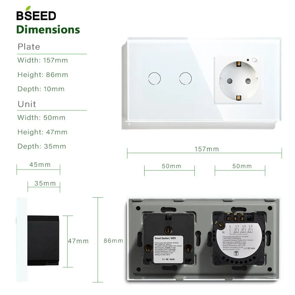 Умный сенсорный выключатель Bseed с Wi-Fi, 2 клавиши, розетка европейского стандарта, 3 цвета, стеклянная панель, работает с приложением Smart Life Tuya