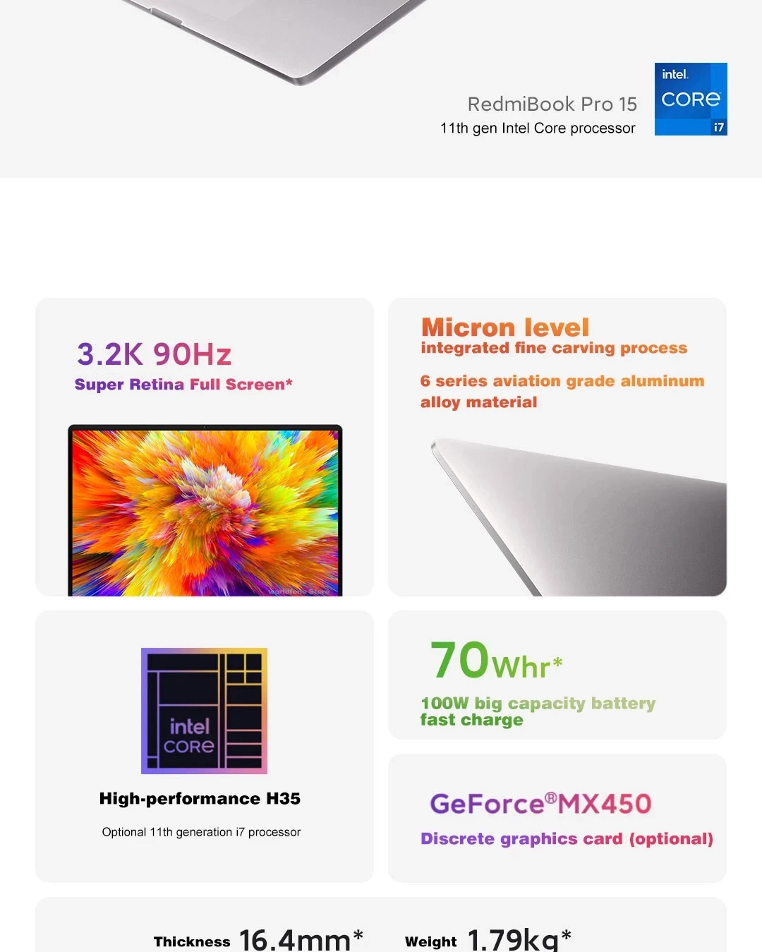 Новинка, оригинальные ноутбуки Xiaomi Redmibook Pro 15, Intel Core i7-11390Hi5-11320H, ноутбук 15,6 дюйма MX450, Windows 10, компьютер 16 Гб