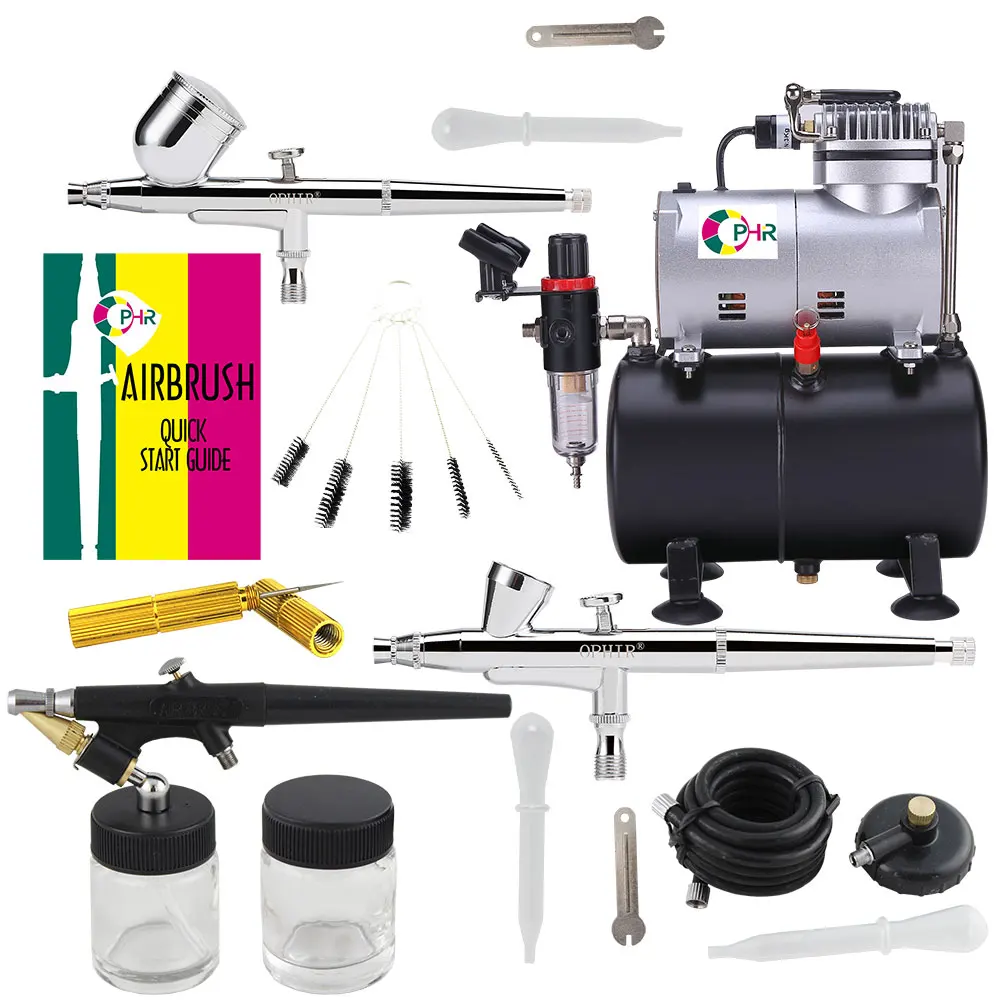 1x одноцилиндровый поршневой компрессор с воздушным баком3x Набор Аэрограф1x1,8 м шланг для подачи воздуха1x воздушный фильтр1x Мини-держатель аэрограф1x руководство по быстрому запуску аэрографЩетка для чистки 5x1X Игла для очистки аэрограф