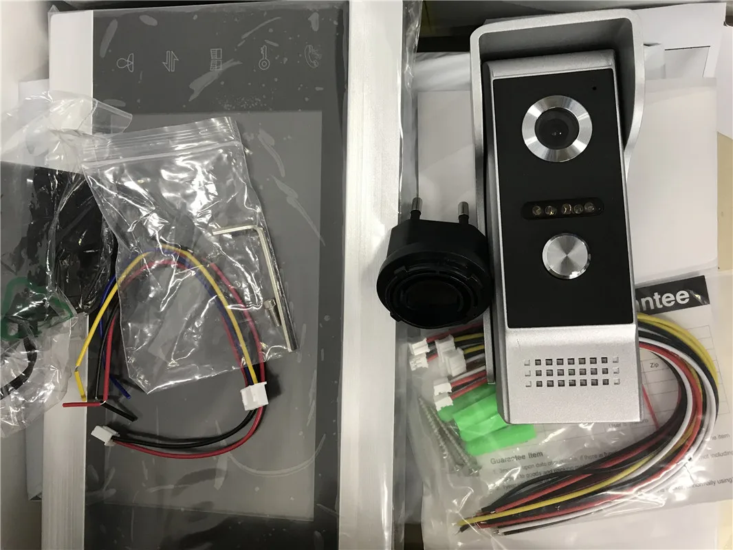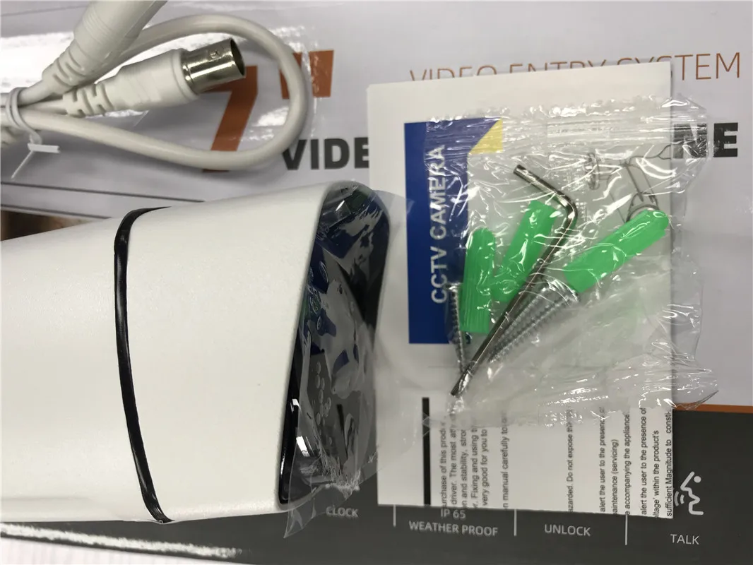 1 внутренний монитор1 дверной Звонок1x адаптер питания5x200 мм 4-контактный разъем2х гарантийная карта2x руководство пользователя на английском языке1 наружная панель вызова1x200 мм 2-контактный разъем, производство Китай2x винтовой мешок 2x квалифицированный сертификат