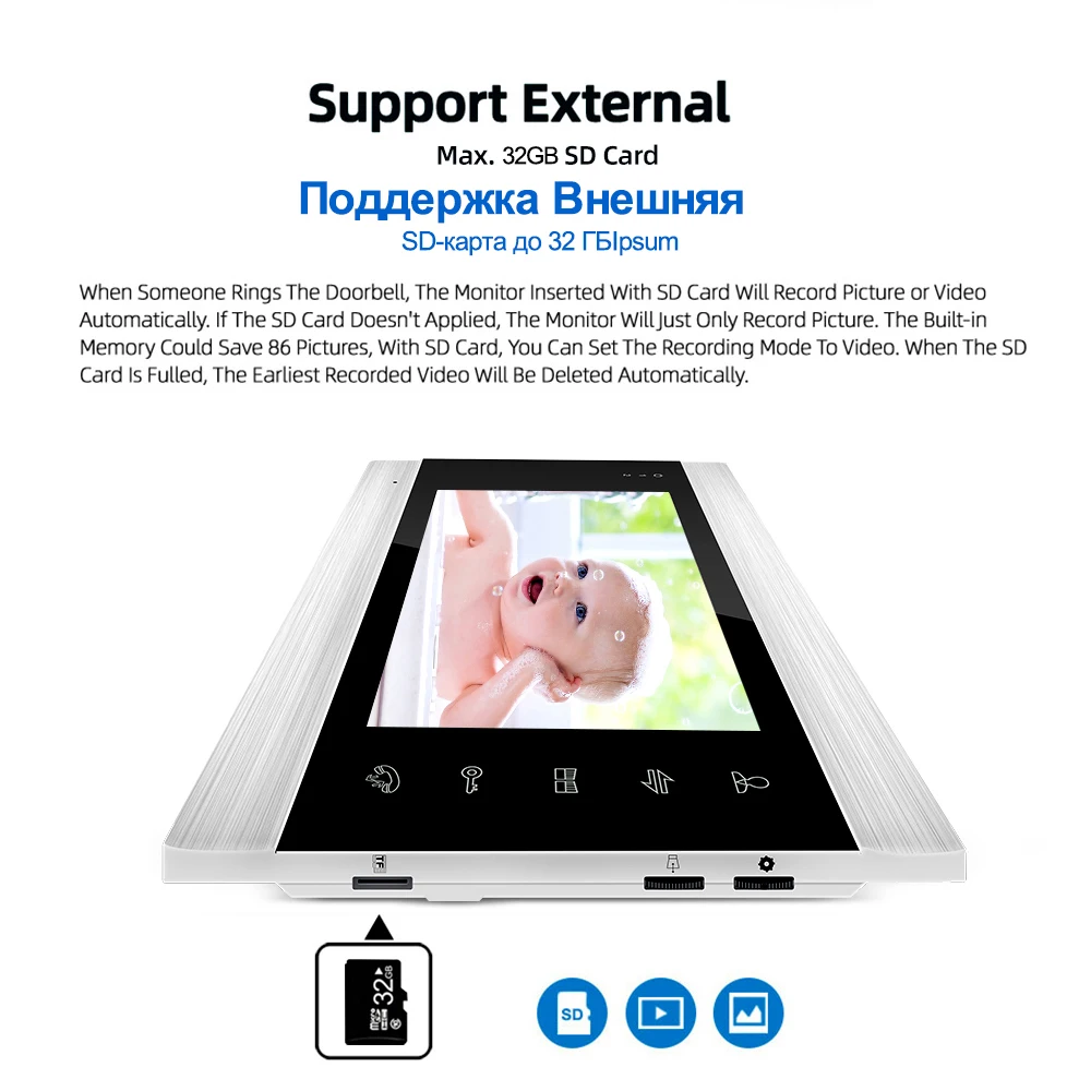 Когда кто-то звонит в дверной звонок, монитор, вставленный с sd-картой, будет записывать изображение или видео автоматически. Если sd-карта не применяется, монитор будет только записывать изображение.Встроенная память может сохранять 86 фотографий, с sd-картой, вы можете настроить режим записи на видео. Когда sd-карта будет заполнена, самое раннее записанное видео будет удалено автоматически.