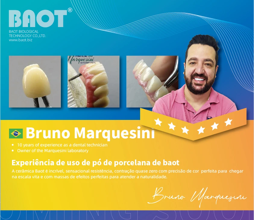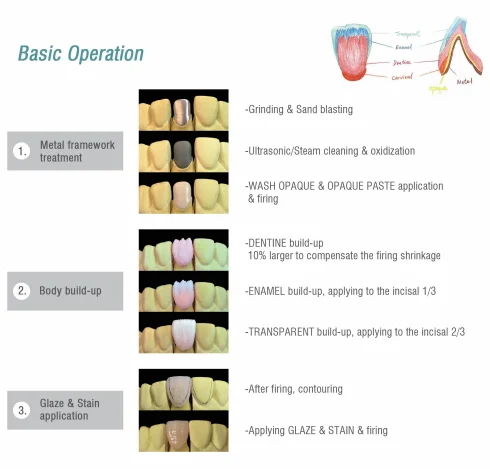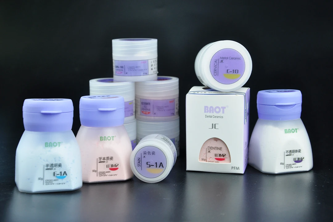 BAOT настаивает на качестве в первую очередь при выборе материалов, обеспечивая стабильность коэффициента линейного расширения, биологических свойств, химических свойств и механических свойств. В специальных средах нет разложения производительности.Химический состав фарфорового порошка BAOT-оксид кремния, оксид алюминия, оксид калия, оксид натрия, цирконий, оксид кальция, оксид бора и т. д. Он в основном вводится из калия feldspar, и через катализ он многократно кристаллируется для формирования кристаллов граната, который имеет хорошую биосовместимость, химическую стабильность, Прочность и твердость подходят для ротовой структуры и функции. Во время кристаллизации граната, с помощью контроля процесса, технические требования, такие как прозрачность и прозрачность, могут быть выполнены, чтобы обеспечить хороший искусственный эстетический эффект естественных зубов по сравнению с человеком.Новейшие модификаторы BAOT, такие как opalescent, прозрачный синий, флуоресцентный и другие эффекты, имеют Новое улучшение в моделировании.Полностью циркониевый паста для внешнего моделирования BAOT обеспечивает больший сценарий применения для полностью циркониевый корпус.
