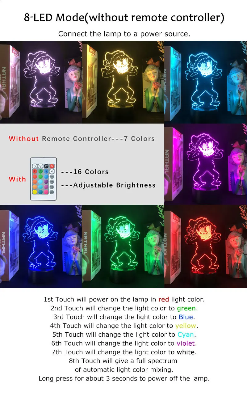 Артикул Тип: 3D светодиодный ночной СветильникОсновной Материал: АБС-пластикСветильник Материал направляющей пластины: акрилПроцесс: лазерная гравировкаРежим питания: USB/батарея (батарея не входит в комплект)Светильник источник света: светодиодныйСветильник: 7 цветов или 16 цветовСветильник: 3D стереоскопический рисунок (как показано на фотографии)Режим переключения: сенсорный выключатель/сенсорный выключатель + пульт дистанционного управленияНапряжение продукта: 5 ВМощность продукта: 3 Вт