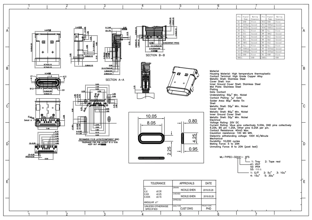 Вертикальный Штекерный разъем USB 3,1 типа C, 16 контактов, 20 шт.