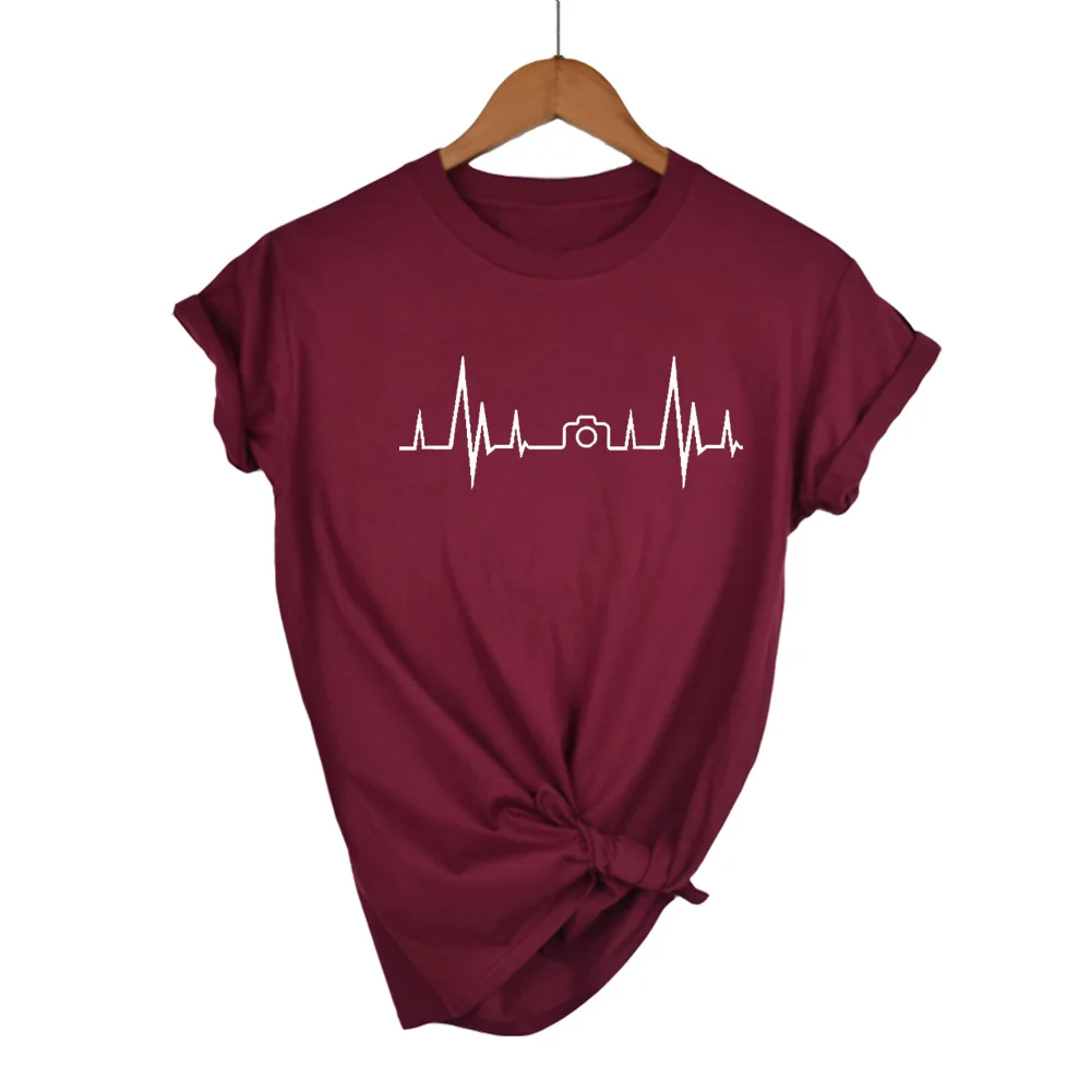 Женская футболка с изображением пульса и камеры, хлопковая Повседневная забавная футболка, Женский Топ для молодых девушек, футболка высокого качества, Прямая поставка, 13 цветов, Прямая поставка