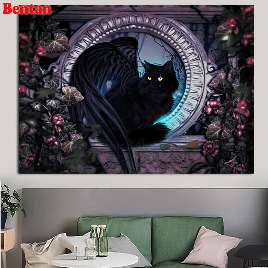 5D алмазная живопись сделай сам, черная кошка, крыло, полностью квадратная, круглая бура, 2021 Алмазная вышивка, инкрустированное искусство, домашнее украшение для стен комнаты