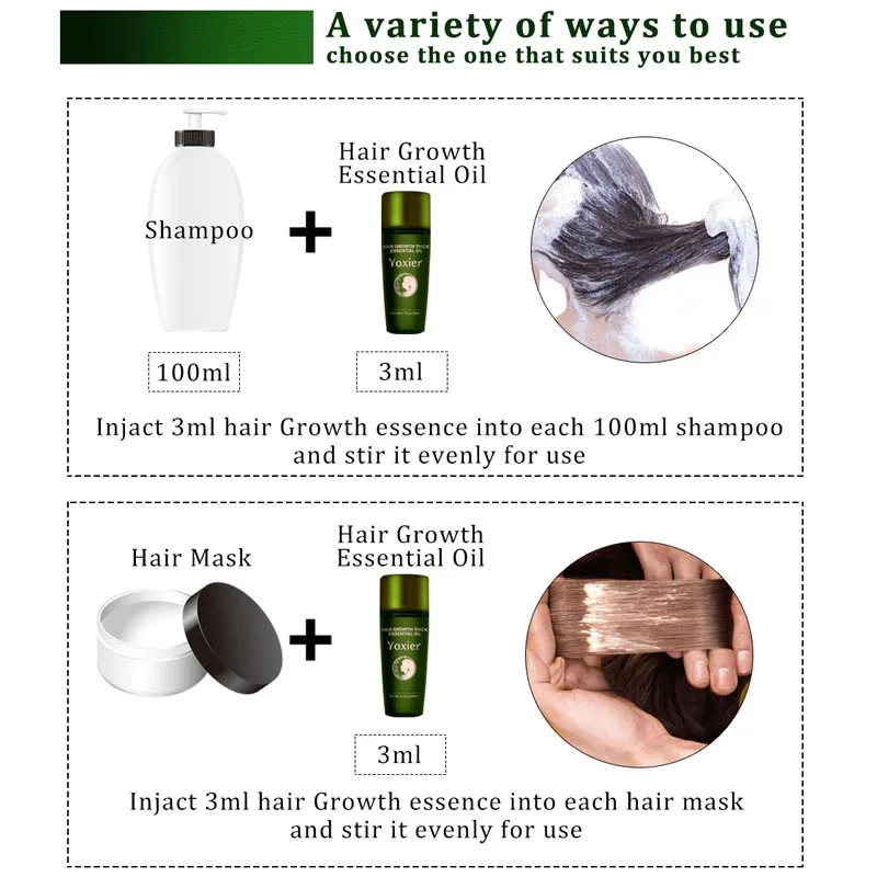 Введите 3 мл эссенции для роста волос в каждую маску для волос и равномерно перемешайте ее для использования