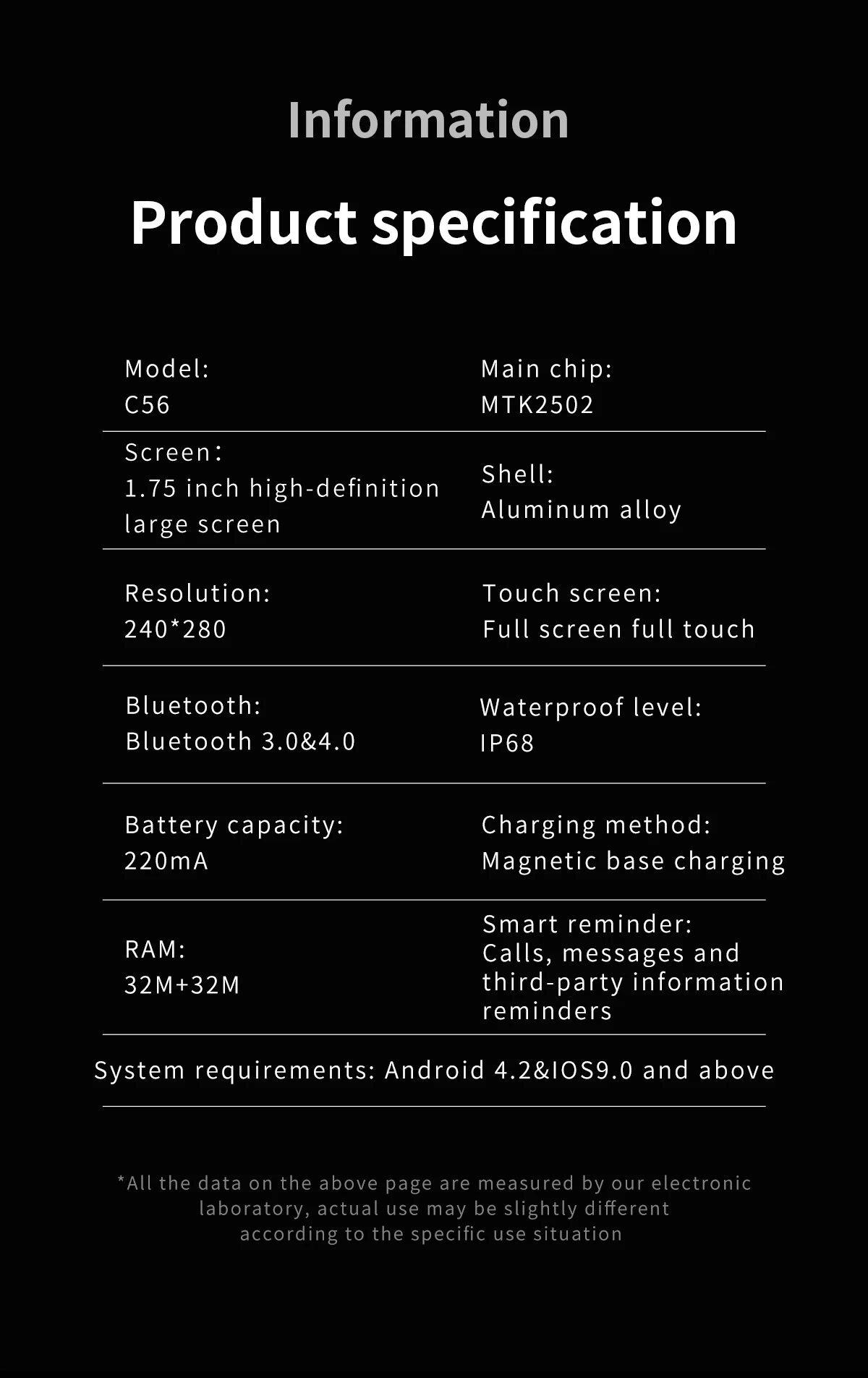 -- Основной чип: MTK2502-- Экран: 1,75 дюймов FD полный сенсорный экран Экран-- Разрешение: 240*280-Аккумулятор: полимерный аккумулятор 220 мАч-Основные функции: bluetooth-вызов, пользовательский циферблат, напоминание о сообщениях, обнаружение упражнений, кровяное давление, кислород в крови, мониторинг сна и других видов здоровья, будильник, секундомер, синхронизация погоды-Bluetooth: BT4.0-- Название модели: C56-- Приложение: Lefun Wear-- Язык интерфейса: английский, русский, испанский, португальский, турецкий, итальянский, французский, арабский