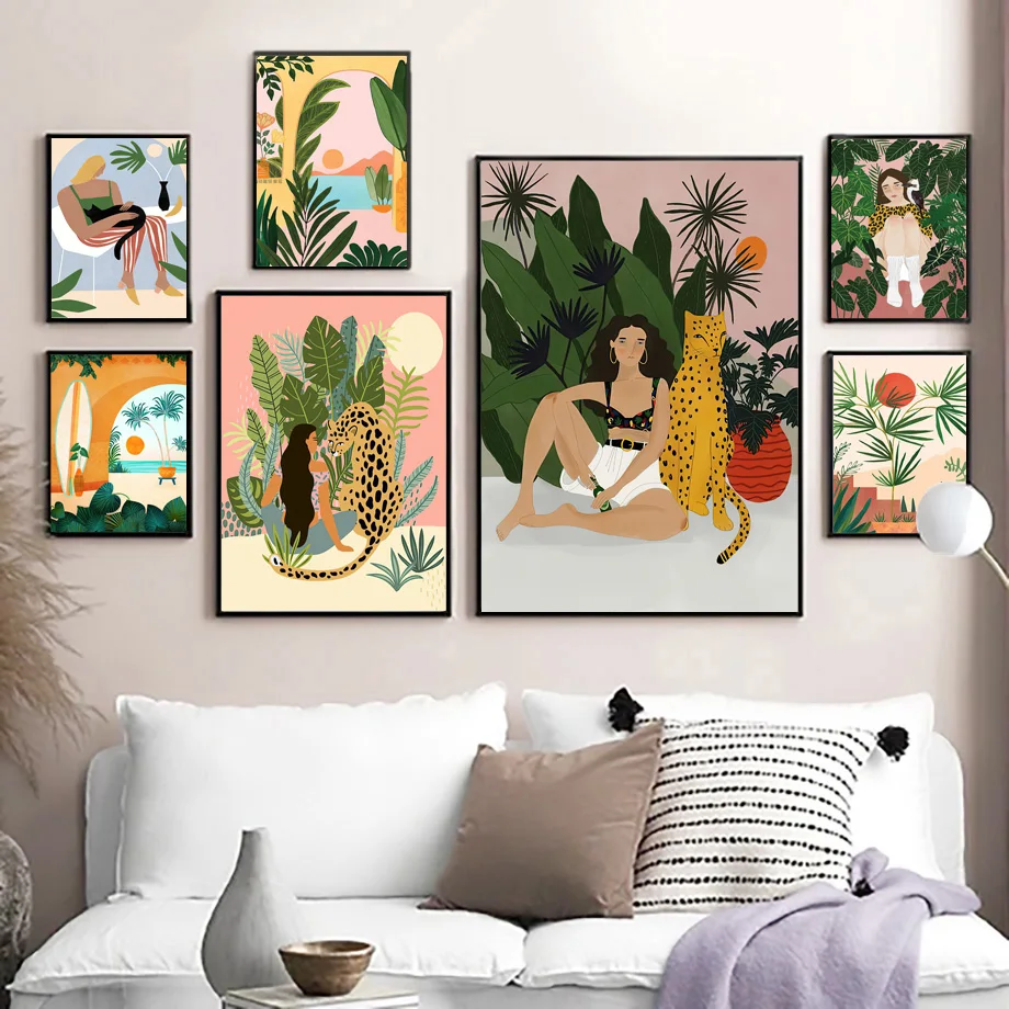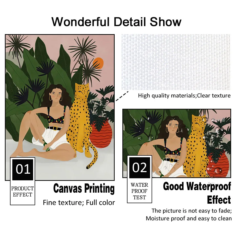 Абстрактная девушка монстера растение Ягуар настенная Картина на холсте скандинавские плакаты и принты настенные картины для гостиной Бохо Декор