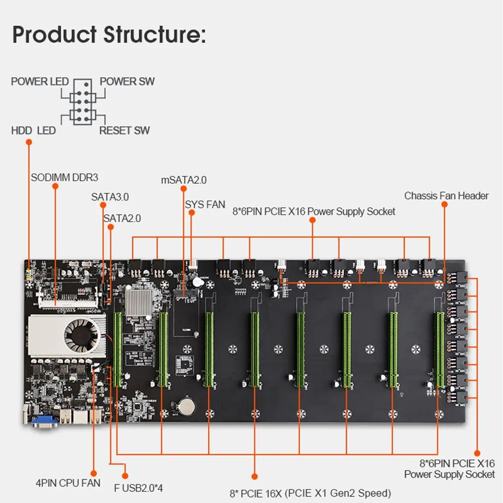 1. Слот для памяти: 8 разъемов для видеокарт, включая HDMI-совместимый + VGA + 2 * SATA + mSATA 2,0 + 8 * PCIE 16X.
