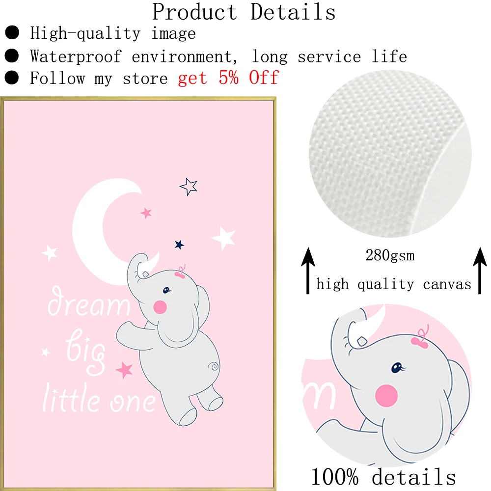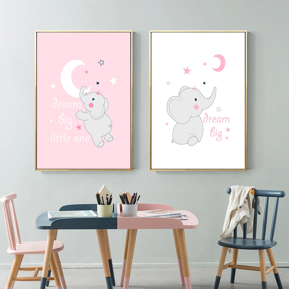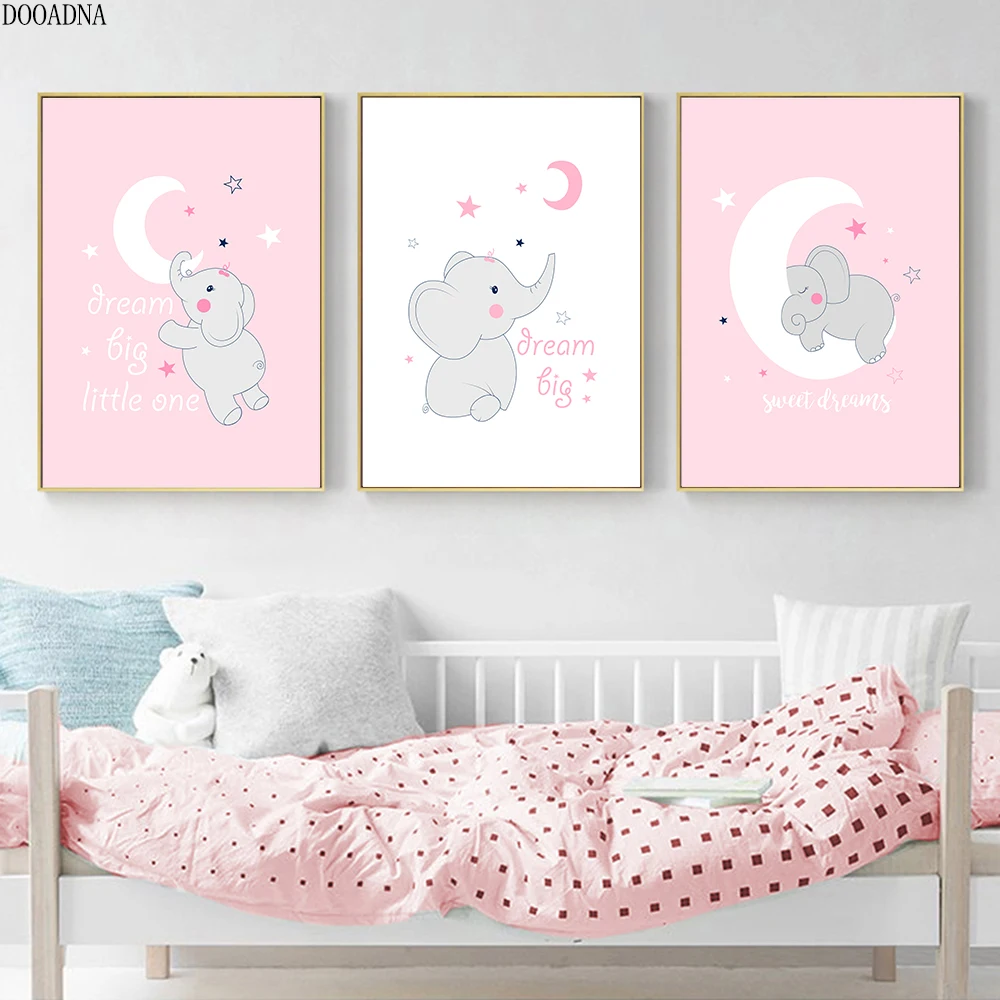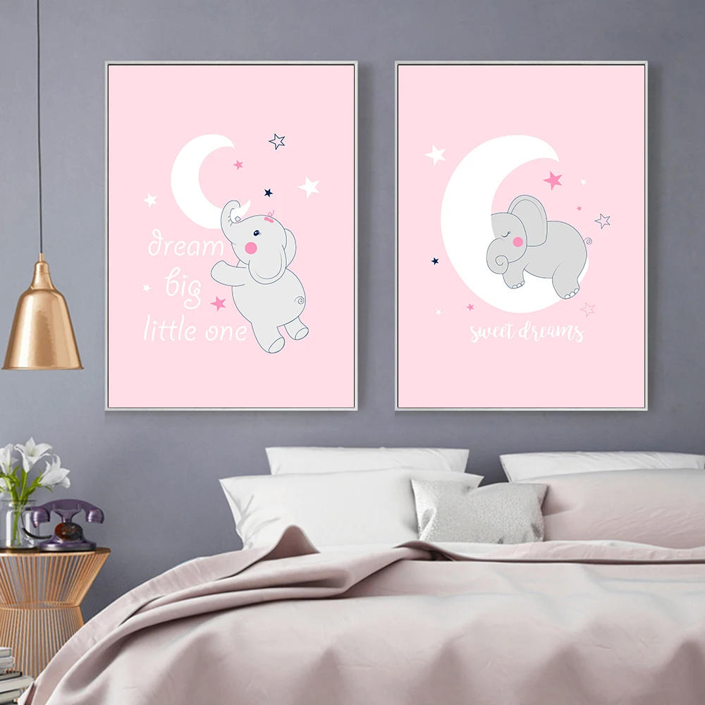 Милый розовый постер с мультяшными животными, луна, звезда, слон, украшение для детской комнаты, картина для украшения детской комнаты