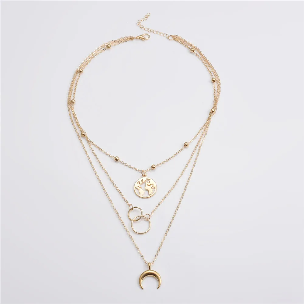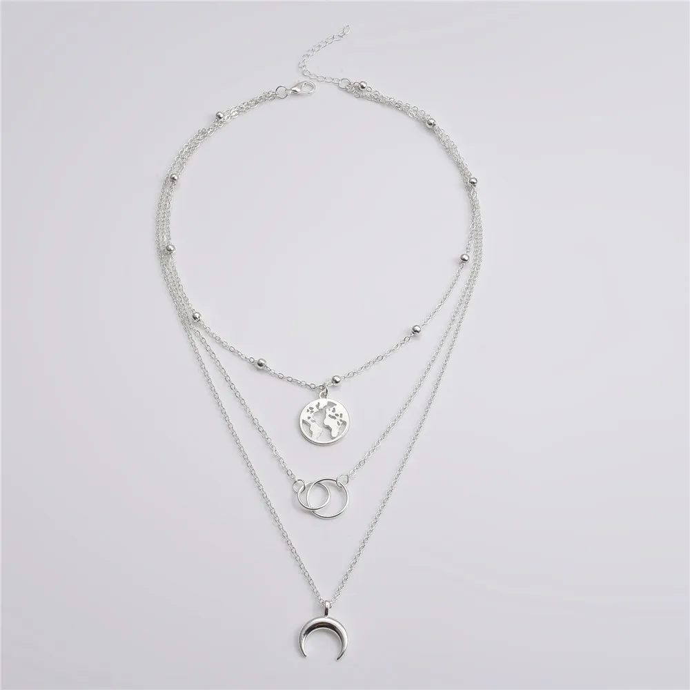 Модная винтажная Женская цепочка на шею, луна, Карта мира, кулон, серебряные цепочки, многослойное золотое ожерелье, ювелирные изделия для девочек