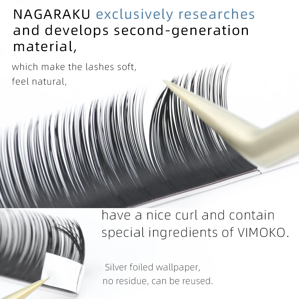 * NAGARAKU занимается исключительно исследованием и разработкой материалов второго поколения, содержит специальные ингредиенты VIMOKO, высокое качество, супер мягкий и натуральный;* Стабильный стандарт great curl, все ресницы были стерилизованы при температуре 135 градусов в течение более 2 часов;* Натуральный длинный конический стиль, более легкий и мягкий;* Серебристые обои без остатка, могут быть повторно использованы;