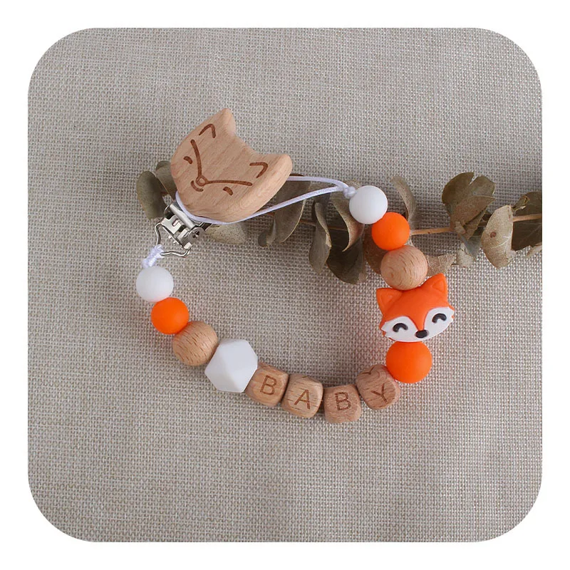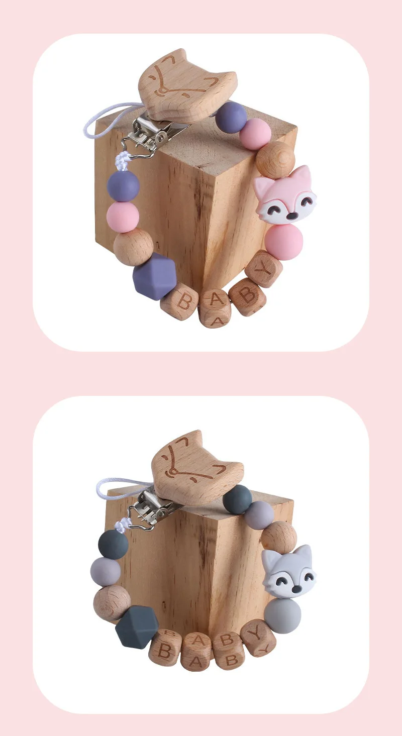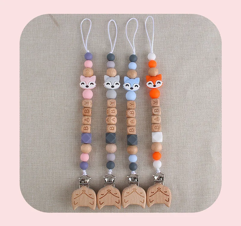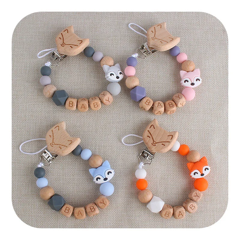 Деревянная цепочка для соски Coskiss с персонализированным именем сделай сам, мультяшная лиса, силиконовые бусины, прорезыватель, жевательная игрушка, зажимы для соски, держатель-цепочка