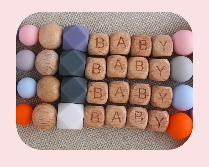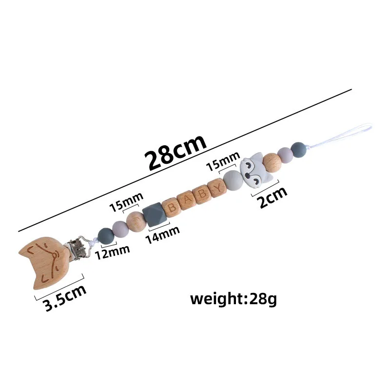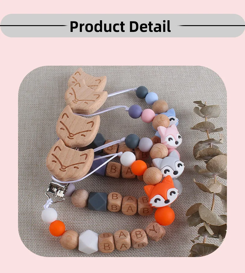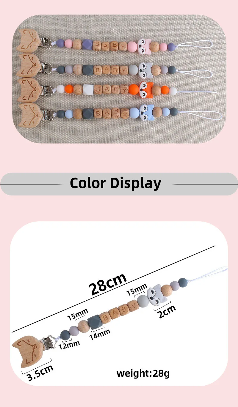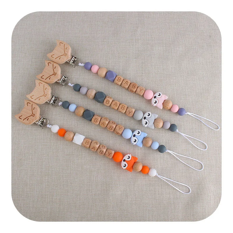 Деревянная цепочка для соски Coskiss с персонализированным именем сделай сам, мультяшная лиса, силиконовые бусины, прорезыватель, жевательная игрушка, зажимы для соски, держатель-цепочка