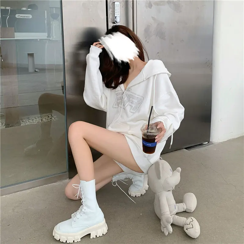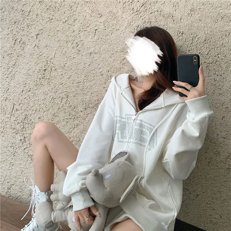 Y2K Harajuku Стразы с капюшоном на молнии в Корейском стиле свободн...