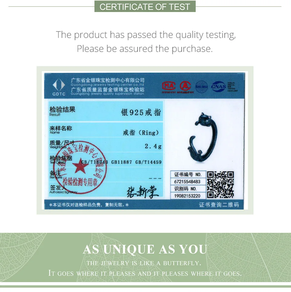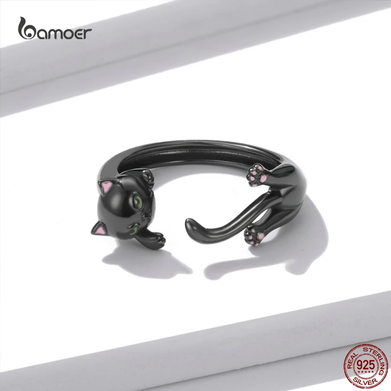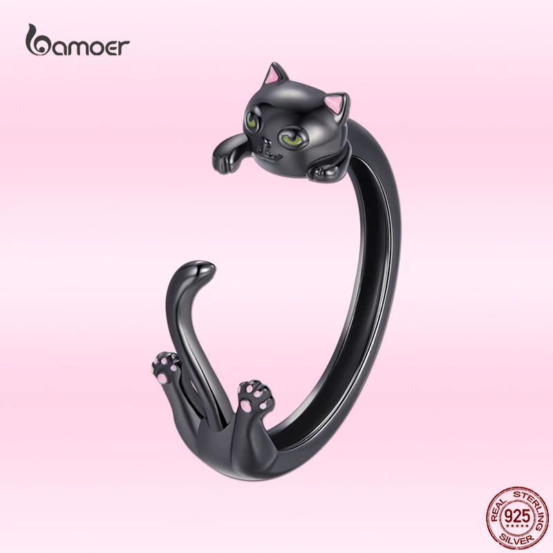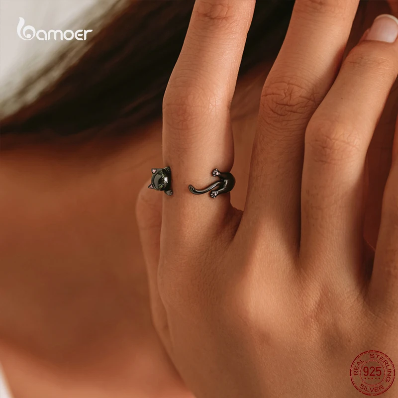 Женское кольцо с котом Bamoer, оригинальное регулируемое кольцо из стерлингового серебра 925 пробы с черным котом, ювелирное изделие
