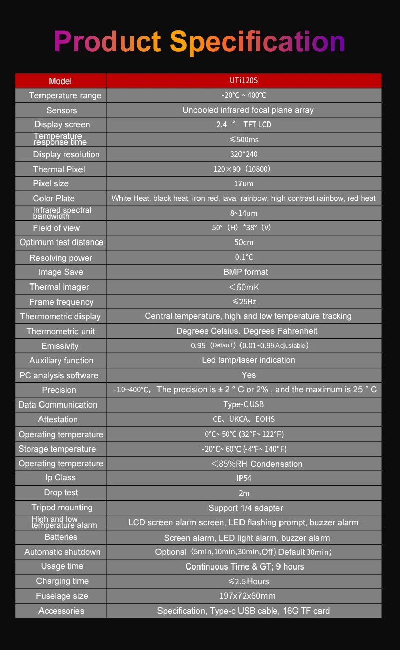 Технические параметрыДиапазон температур: -15 °C ~ 550 °C (5 °F ~ 1022 °F)Точность: ± 2 °C/± 2% в зависимости от того, что большеДатчик: фокальная плоскость без охлажденияРЕЖИМ высокого усиления: -15 °C ~ 150 °C, низкий коэффициент усиления: 150 °C ~ 550 °CСоответствующее время измерения температуры: ≤ 500 мсТепловизионные пиксели: 256*192 (49152)Размер пикселя: 12 мкмОбразцы: белый горячий, черный горячий, железный красный, lava, Радуга, высокая контрастность Радуга, Красный ГорячийИнфракрасная полоса пропускания спектра: 8 ~ 14 мкмПоле зрения: 56 ° (В) * 42,2 ° (В)IFOV: 3,8 мрадТепловизионная Чувствительность: <60mKЧастота кадров: <25 ГцДисплей для измерения температуры: измерение температуры в центральной точке, отслеживание высоких температур и измерение температуры в ключевой области (ROI), по умолчанию отслеживается высокая температураТочка измерения температуры: в дополнение к центральной точке, 3 точки измерения температуры могут быть настроеныРежим изображения: Тепловое изображение, слияние, изображение на картинке, видимый светильникВидимый светильник Разрешение: 640x 480Смешанные настройки: 0% (полностью Видимый светильник), 25%,50%, 75%, 100% полное тепловое изображение)Формат изображения: BMPПрограммное обеспечение для анализа ПК: ДаПередача изображения в реальном времени: проекция программного обеспечения ПК в реальном времениПередача данных: USB Type-CIP Рейтинг: IP65Испытание на падение: 2 мЭкран дисплея: 2,8 "TFT LCDРазрешение дисплея: 320*240Батарея: литий-ионный аккумулятор 3,6 V 5000 мА/ч, 26650 одна ячейкаАвтоматическое отключение: опционально (5 мин, 10 мин, 30 мин) Автоматическое выключение по умолчанию 30 минВремя использования: не менее 6 часовВремя зарядки: не более 5 часовНапряжение/ток зарядки: 5 В/2 АХранение изображений: карта Micro SDРазмер изделия: 236*75,5*86 ммАксессуары: руководство, usb-кабель Type-C, карта TF 16G