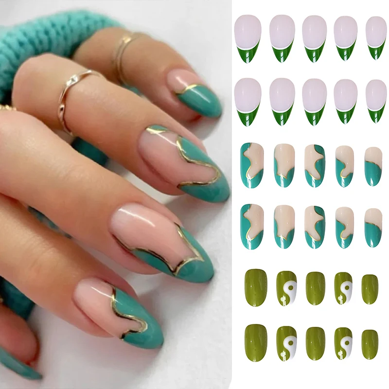 Накладные ногти цвета миндаля, 24 шт., мятно-зеленая золотая нить, ...