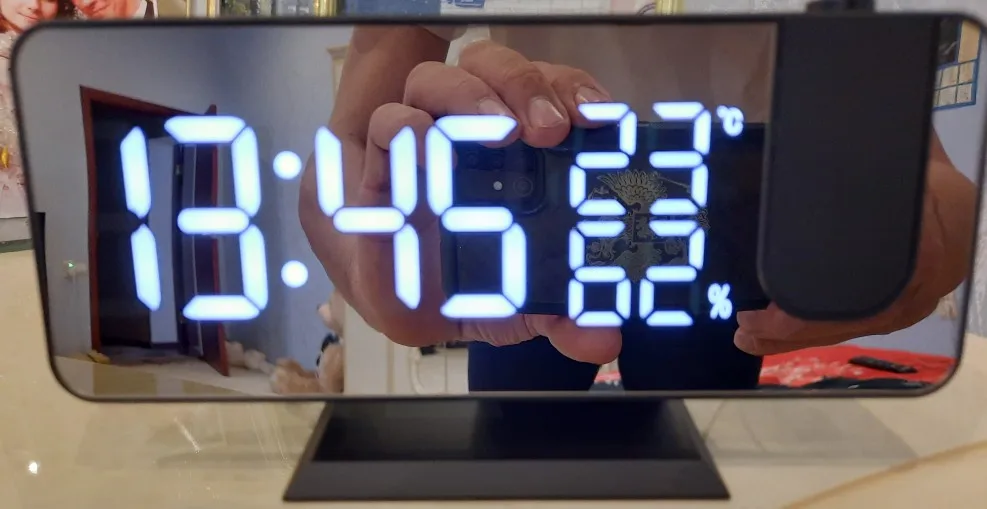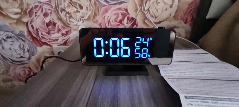 Хорошие часы, всё работает, часы сами нашли радиостанции, около 22, звонок будильника настраивается и на сигнал, и от выбранной FM радио по желанию. Звук будильника по нарастающей, до установленной громкости на радио. Можно устанавливать два будильника на разное время. Показывают температуру и влажность. Проектор устанавливается под любым углом, цифры луча можно менять и в обратном направлении. Работают от зарядки с USB. Довольна покупкой, спасибо производителю и продавцу. Привёз курьер доставкой.