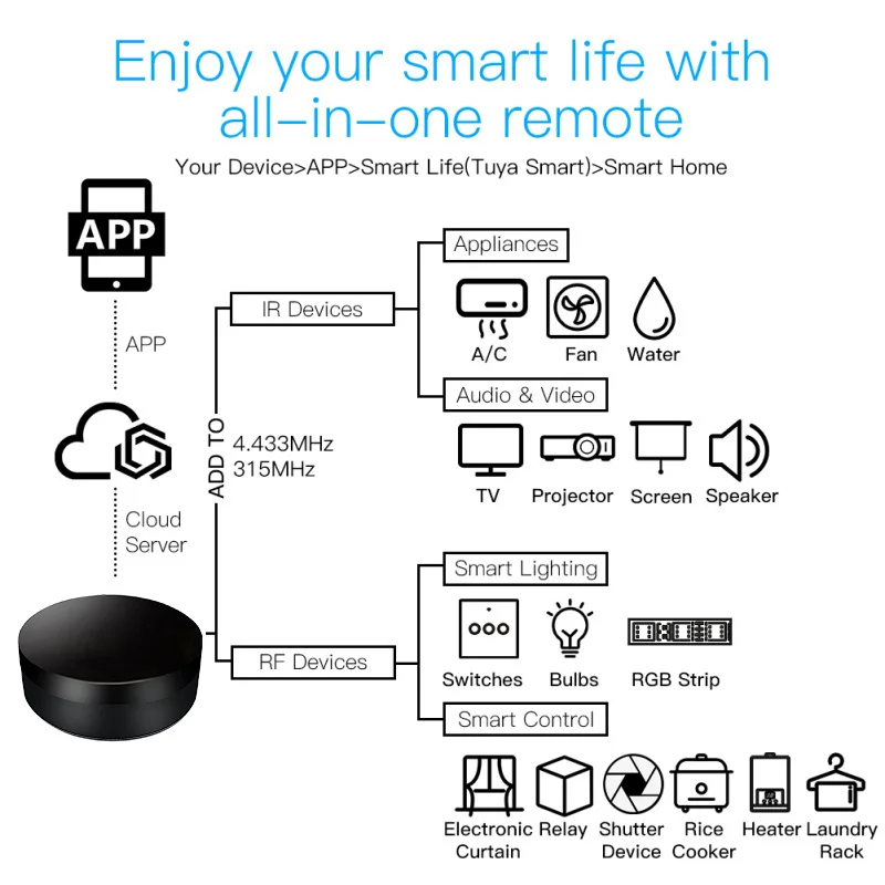 Вы можете управлять бытовыми приборами IR + RF433 в приложении Tuya/Smart life. Поддерживает iOS 8,0 и выше и Android 4,0 и выше смартфонов.