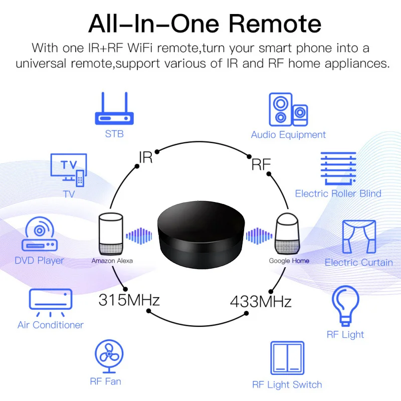 Универсальный пульт дистанционного управления может использоваться для управления электроприборами путем обучения частоте IR38KHz или RF433MHz вашего оригинального пульта дистанционного управления.