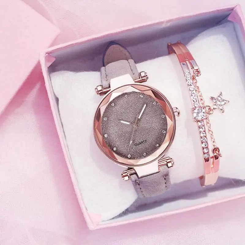 Женские кожаные часы набор Стразы повседневные романтические звездное небо стилист простые кварцевые часы комплект из 2 предметов Gfit платье
