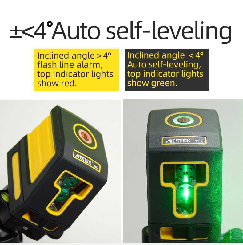 1. Наклонный угол> 4 ° сигнал вспышки, верхний индикатор показывает красный цвет.2. Наклонный угол <4 ° Авто самонивелирующийся, верхний индикатор показывает зеленый цвет.